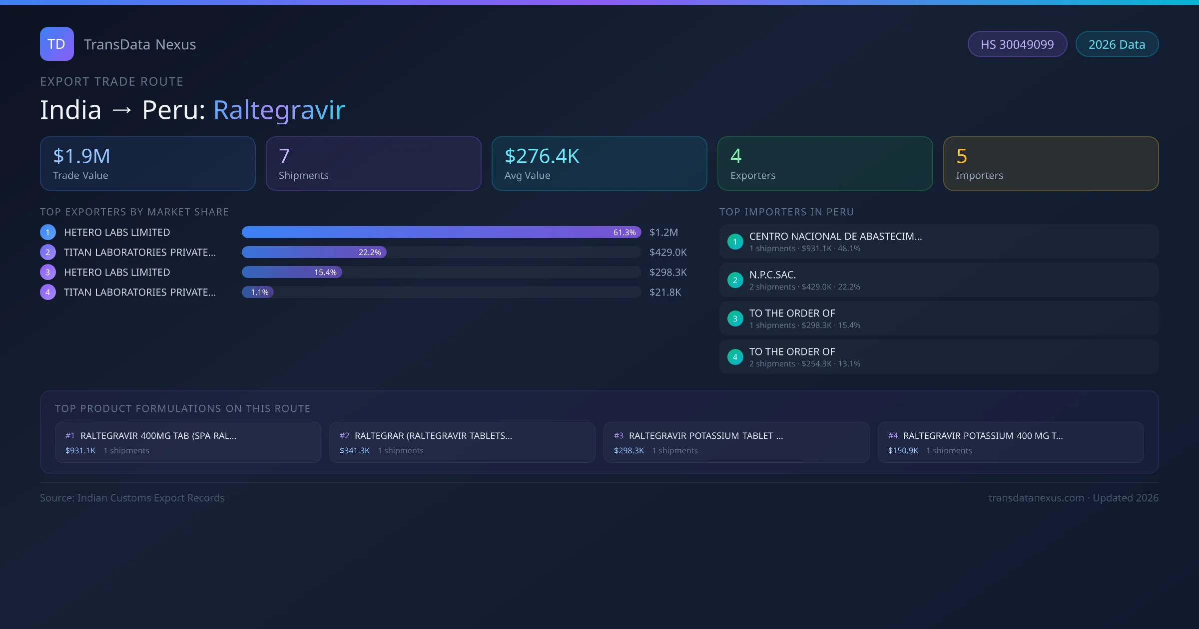 The India to Peru Raltegravir corridor is one of India's established pharmaceutical export routes, with 7 shipments documented worth a combined $1.9M USD. The route is dominated by HETERO LABS LIMITED , which alone accounts for roughly 61% of all export value, reflecting the consolidated nature of India's raltegravir manufacturing sector.