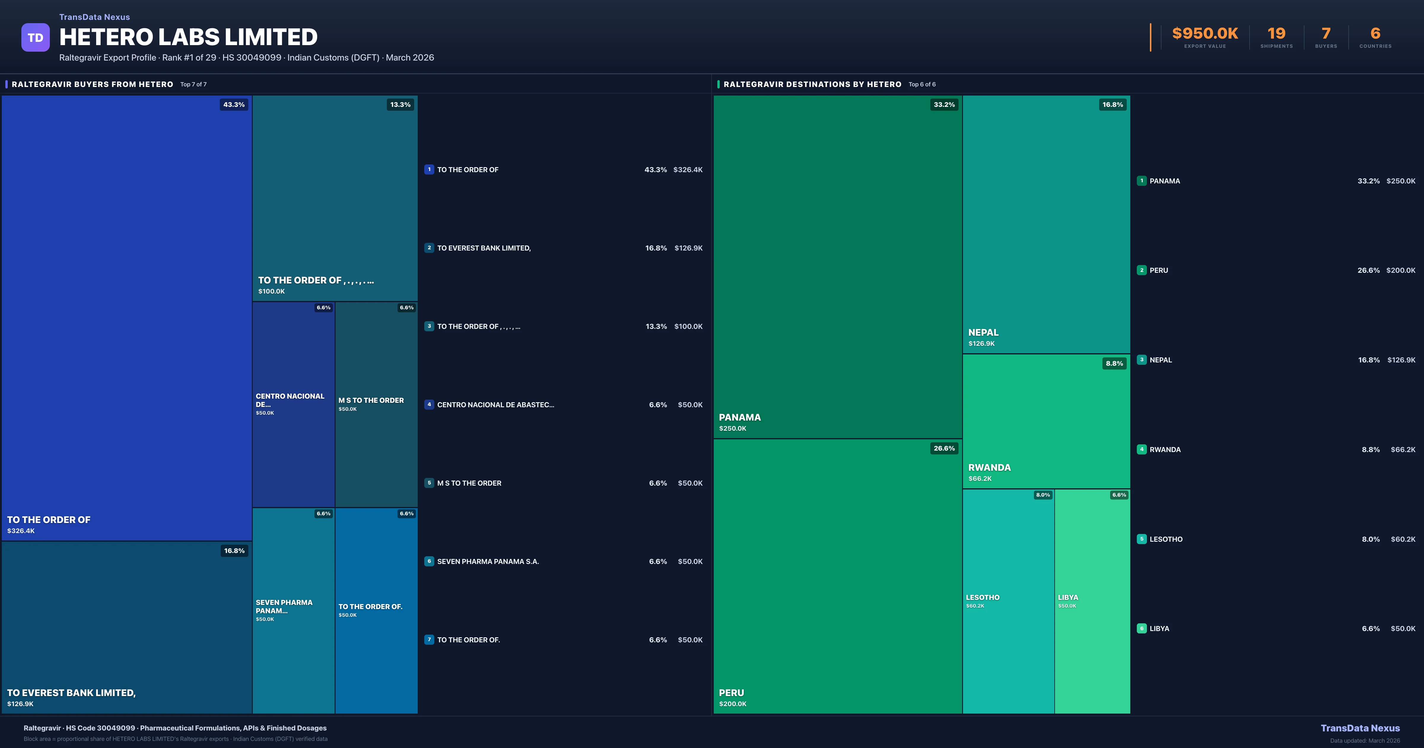 Hetero Labs Limited supplies Raltegravir to 7 buyers globally. The largest buyer is TO THE ORDER OF (PANAMA), followed by TO EVEREST BANK LIMITED, (NEPAL) and TO THE ORDER OF , . , . , . , . , . (PANAMA). These buyers represent pharmaceutical distributors, hospital groups, and government procurement agencies in their respective markets.