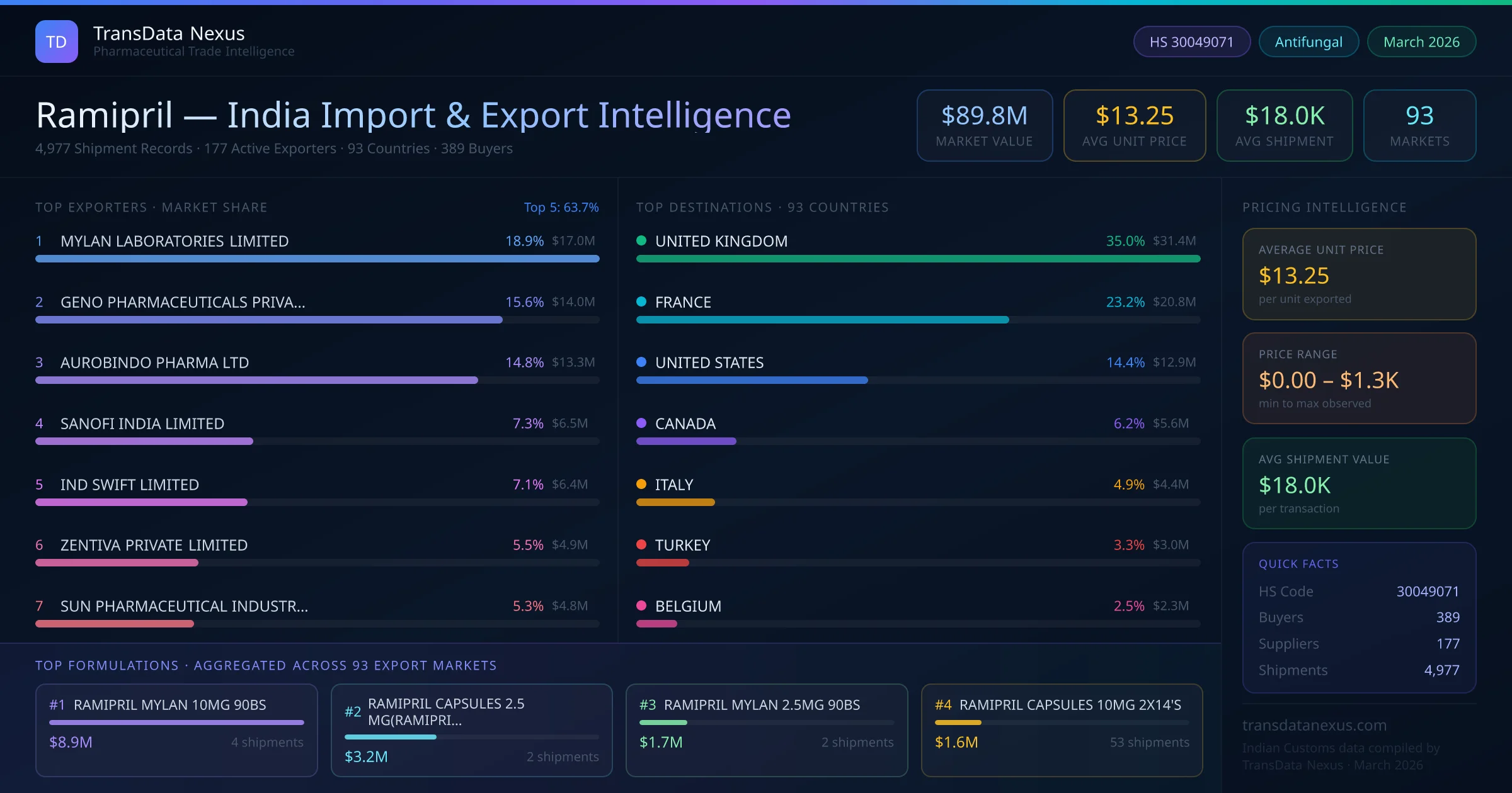 The total export value of ramipril from India is $89.8M, recorded across 4,977 shipments from 177 active exporters to 93 countries. The average shipment value is $18.0K.