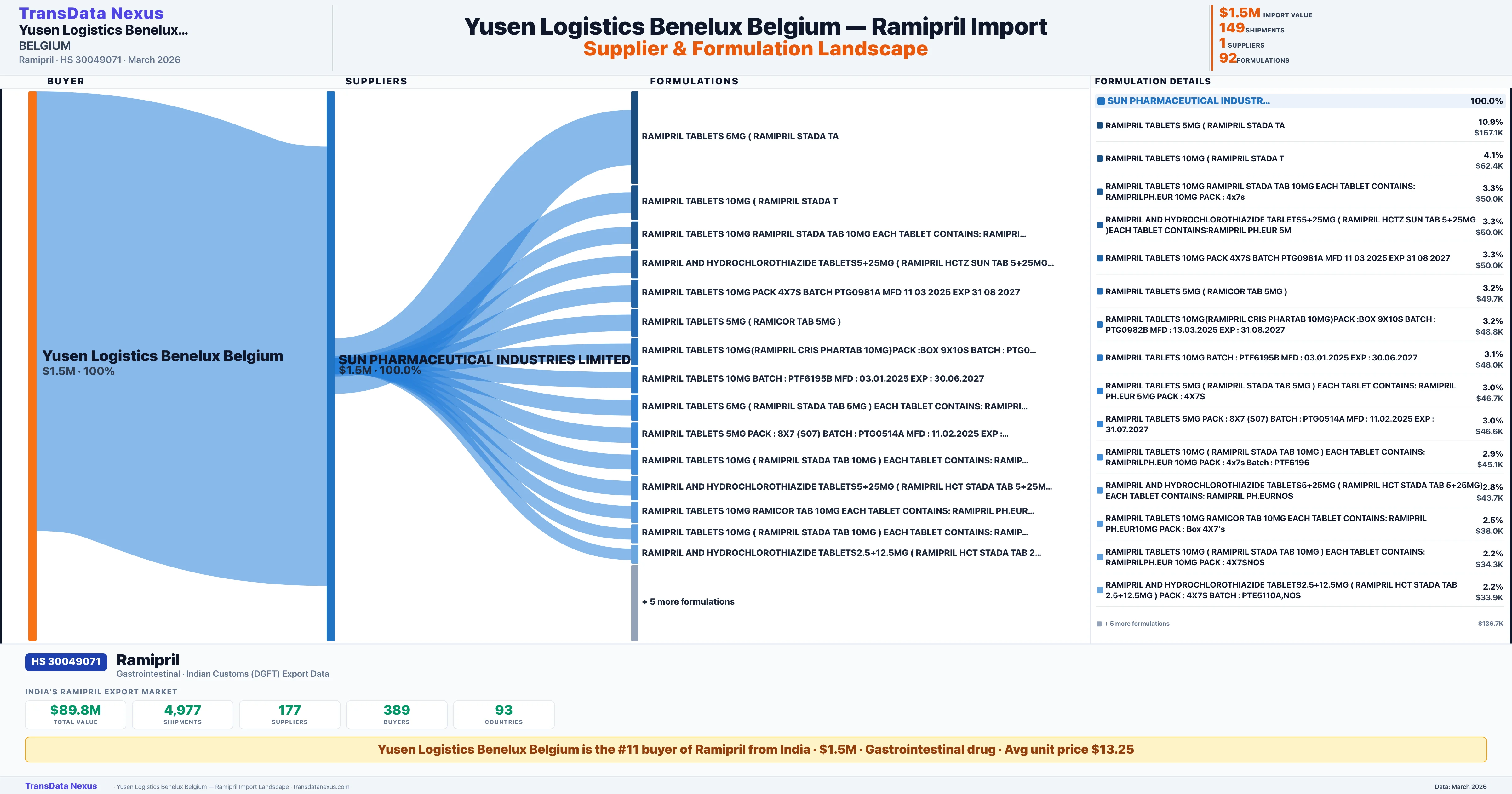 YUSEN LOGISTICS BENELUX BELGIUM sources Ramipril from 1 verified Indian supplier: SUN PHARMACEUTICAL INDUSTRIES LIMITED ($1.5M, 100.0%). This is based on 149 customs records.