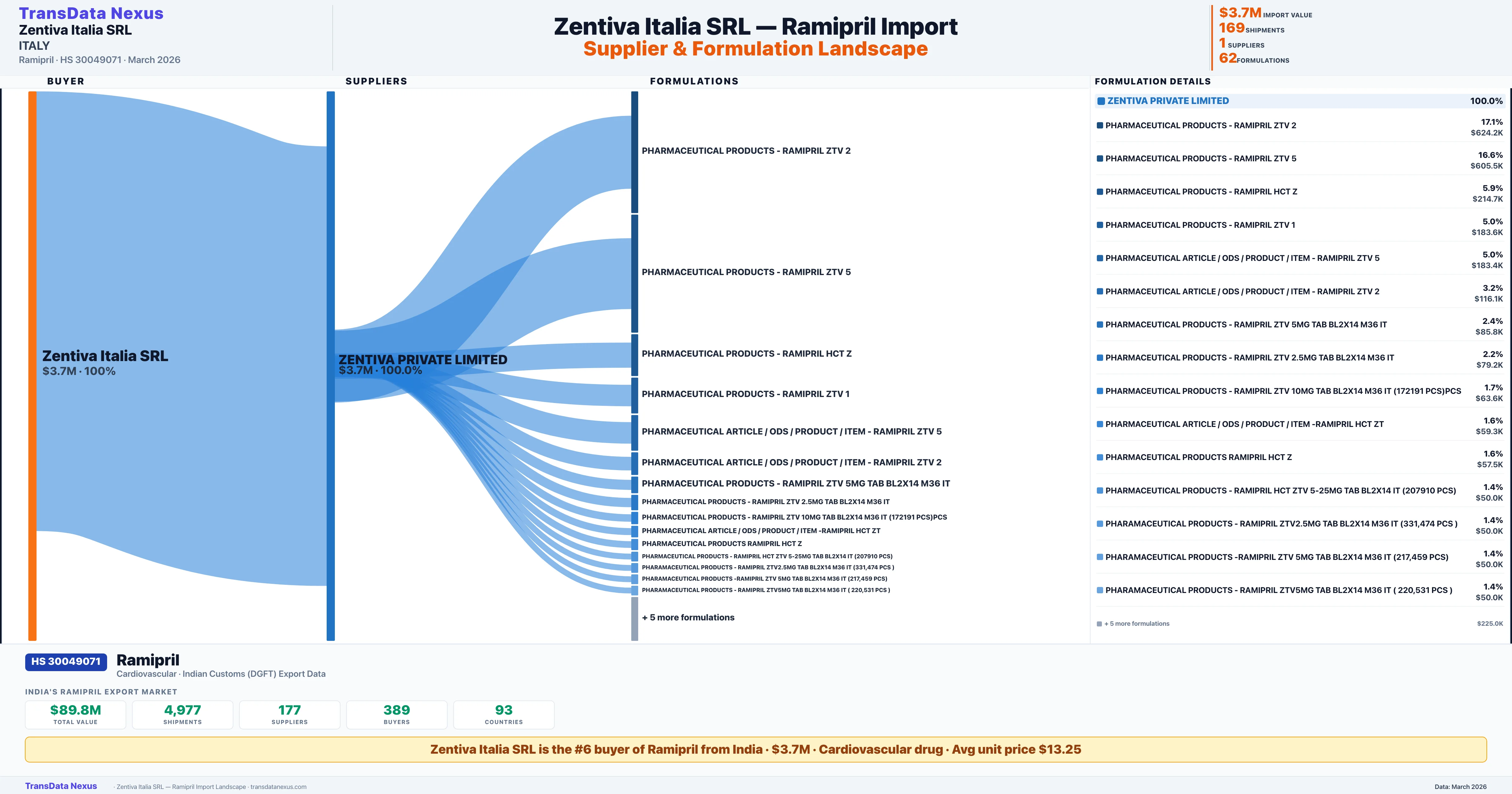 ZENTIVA ITALIA SRL sources Ramipril from 1 verified Indian supplier: ZENTIVA PRIVATE LIMITED ($3.7M, 100.0%). This is based on 169 customs records.