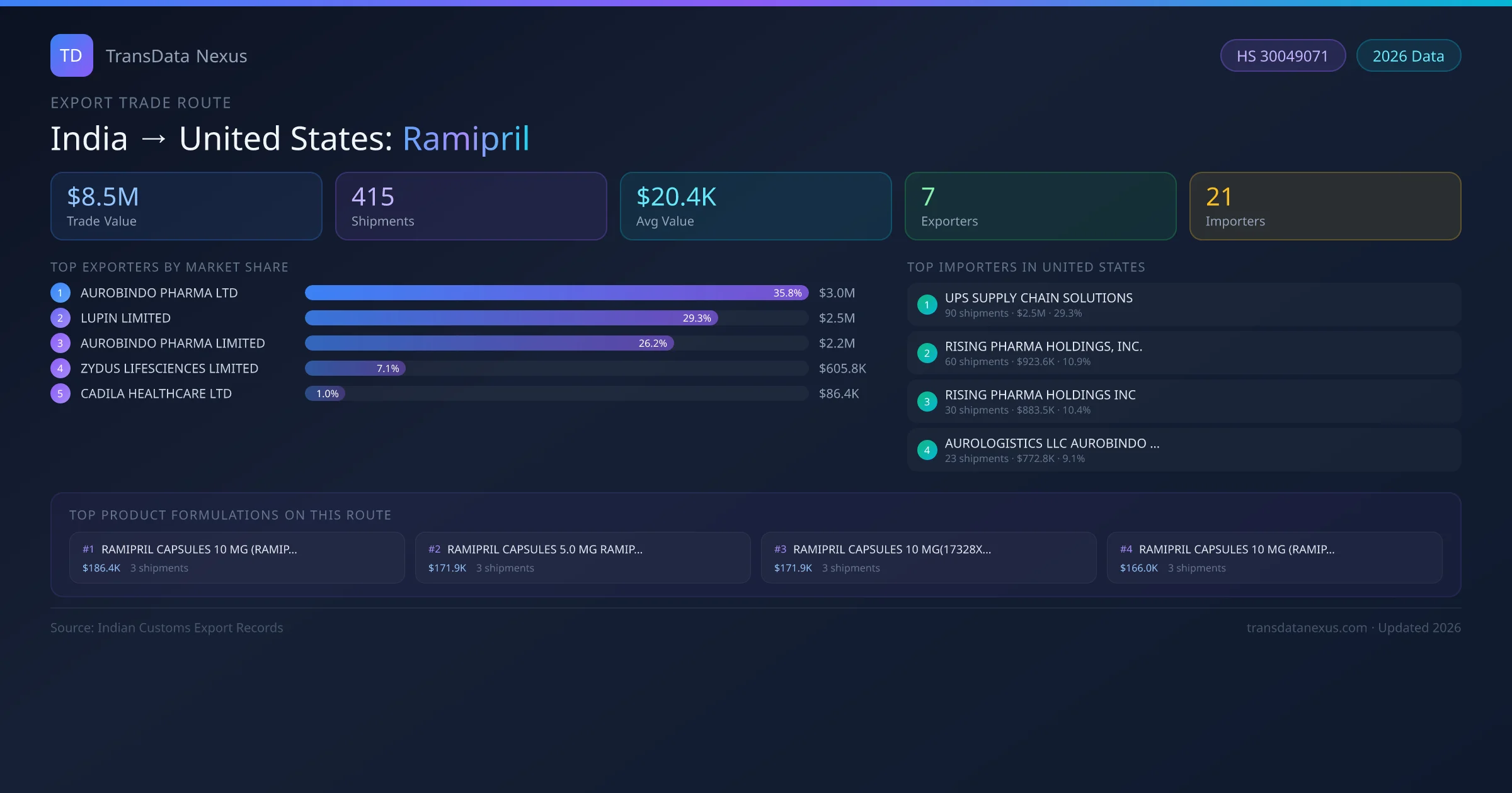 India exports Ramipril to United States worth approximately $8.5M USD across 415 recorded shipments. The average value per shipment is $20.4K USD.