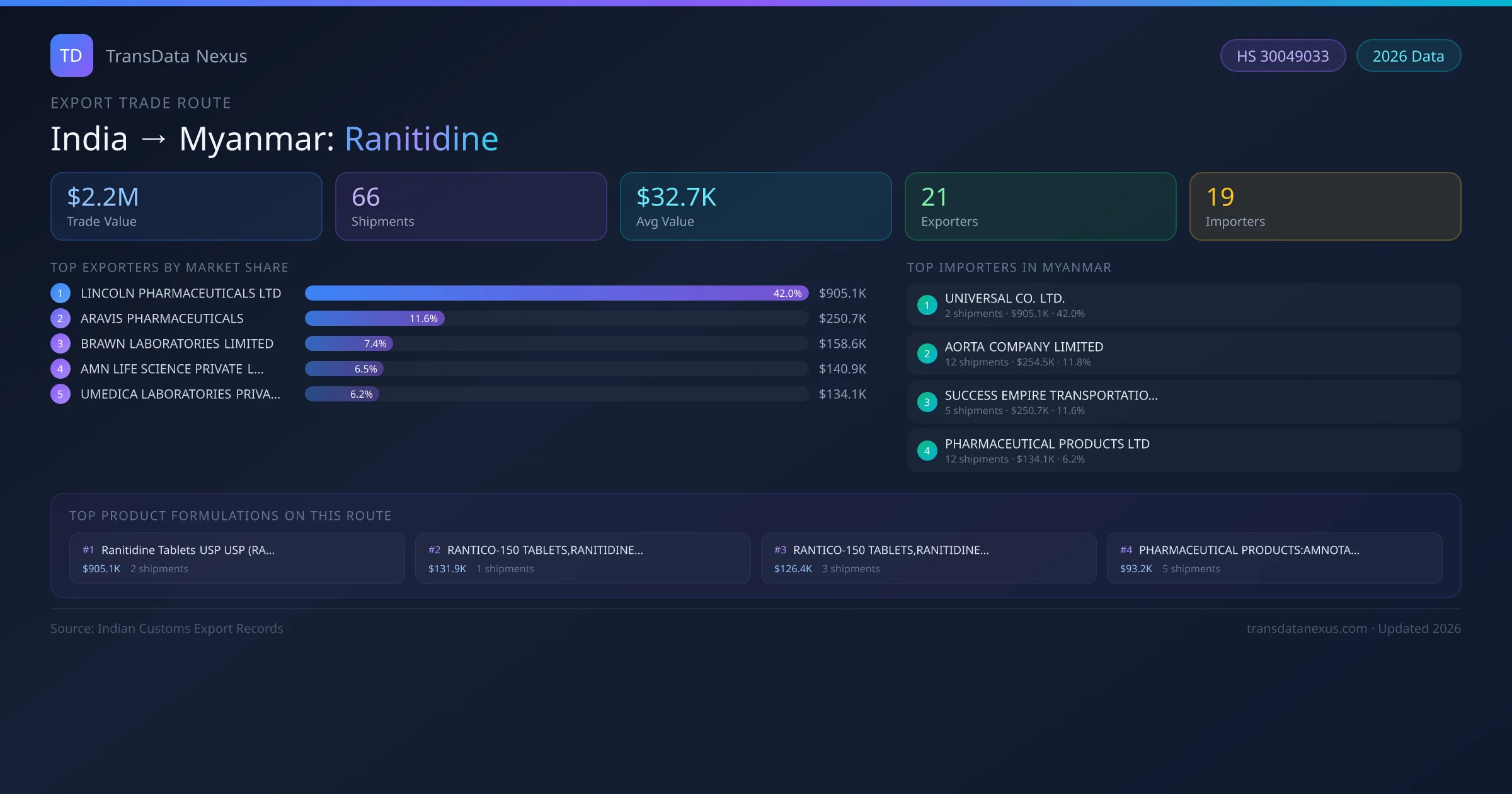 India has recorded 66 verified shipments of Ranitidine exported to Myanmar, representing a combined trade value of $2.2M USD. This corridor is served by 21 active Indian exporters, with an average shipment value of $32.7K USD. The leading Indian exporter is LINCOLN PHARMACEUTICALS LTD, which accounts for 42% of total export value with 2 shipments worth $905.1K USD. On the buying side, UNIVERSAL CO. LTD. is the largest importer in Myanmar with $905.1K USD in purchases. The top 3 suppliers — LINCOLN PHARMACEUTICALS LTD, ARAVIS PHARMACEUTICALS, BRAWN LABORATORIES LIMITED — together control 61% of total trade value on this route. All data sourced from Indian Customs (DGFT) shipping bill records. Values reported in FOB USD.