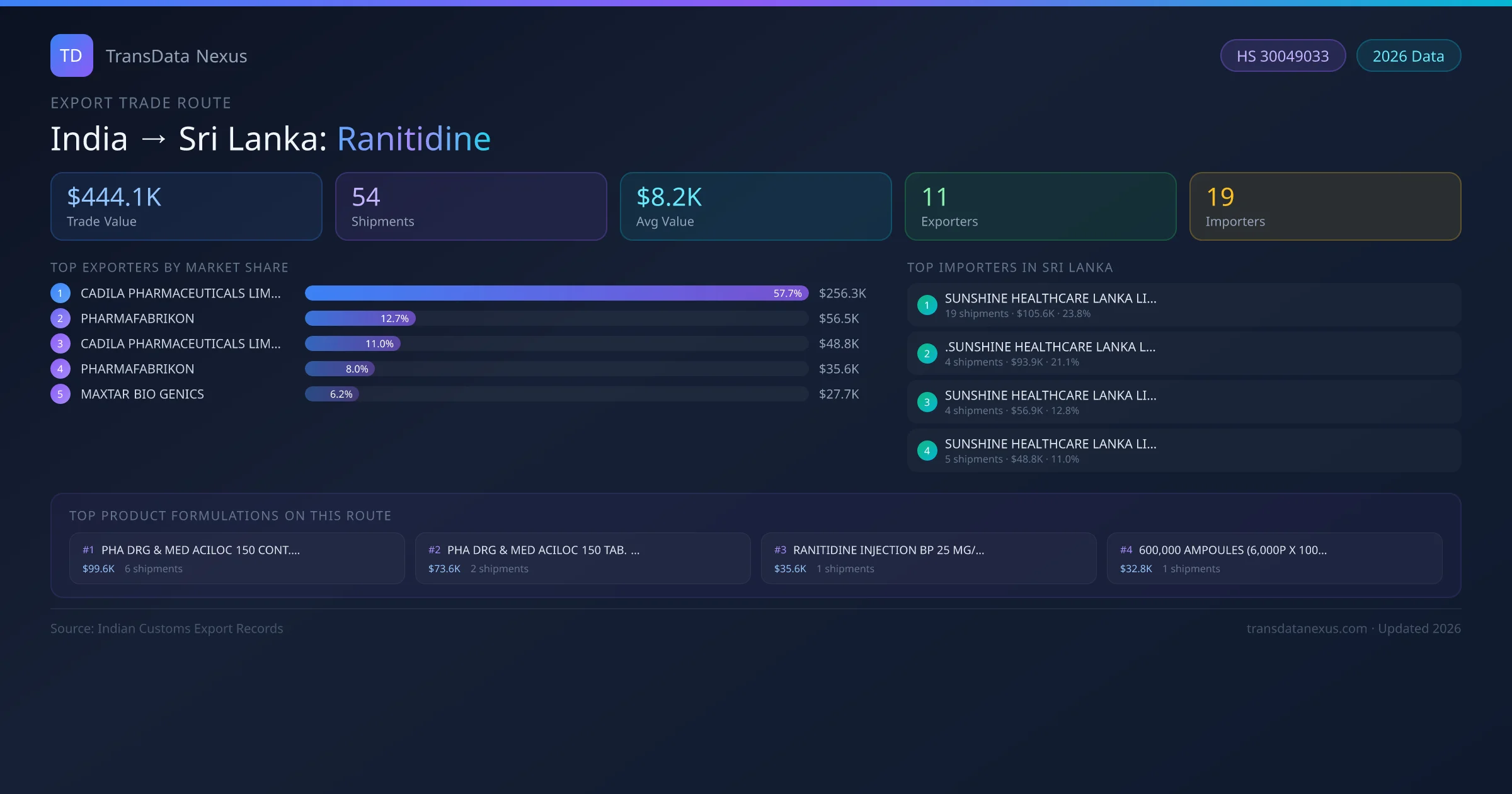 The India to Sri Lanka Ranitidine corridor is one of India's established pharmaceutical export routes, with 54 shipments documented worth a combined $444.1K USD. The route is dominated by CADILA PHARMACEUTICALS LIMITED, which alone accounts for roughly 58% of all export value, reflecting the consolidated nature of India's ranitidine manufacturing sector.
