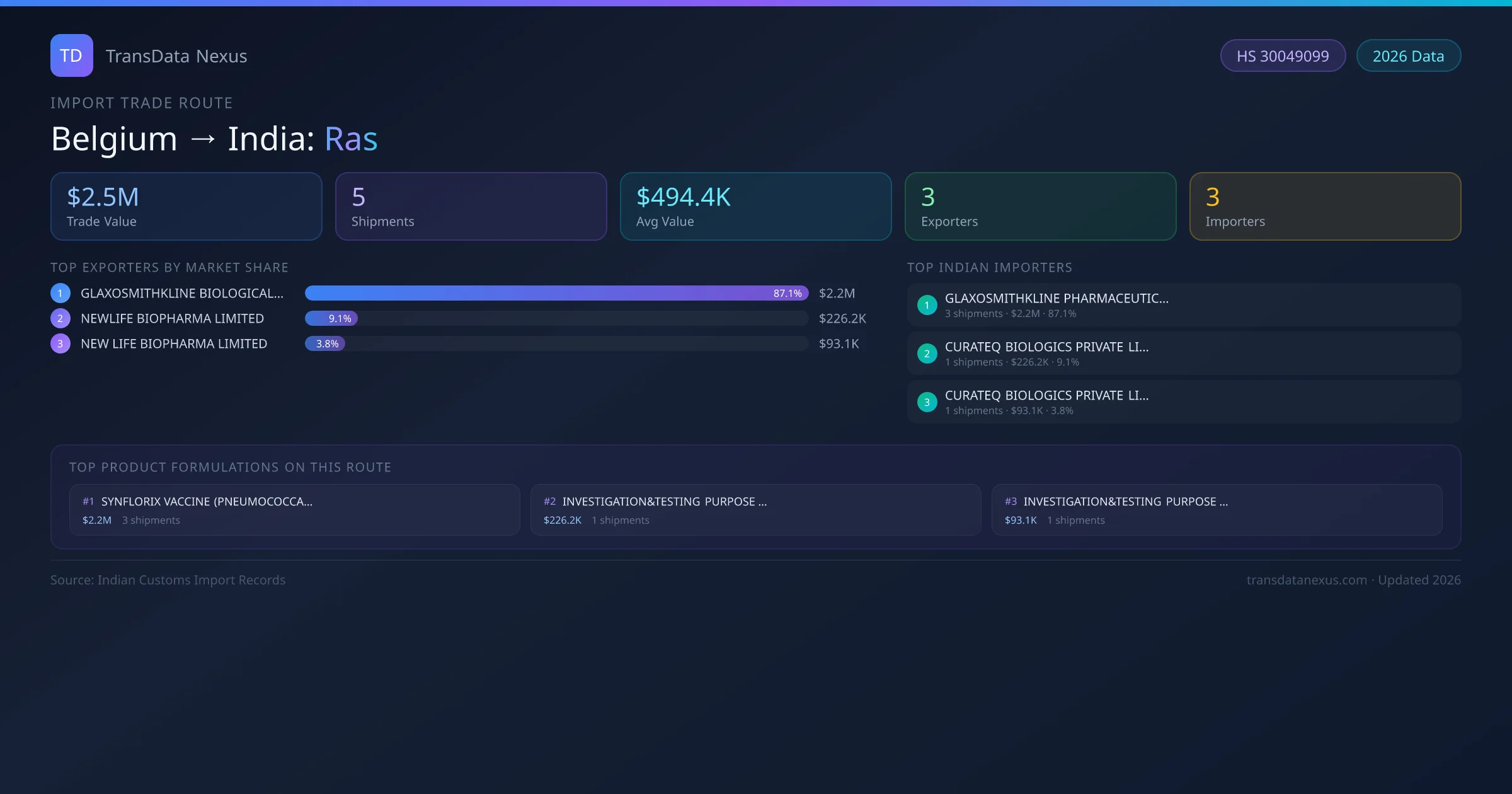 India has recorded 5 verified shipments of Ras imported from Belgium, representing a combined trade value of $2.5M USD. This corridor is served by 3 active Belgium exporters, with an average shipment value of $494.4K USD. The leading Belgium supplier is GLAXOSMITHKLINE BIOLOGICALS SA, which accounts for 87% of total import value with 3 shipments worth $2.2M USD. On the buying side, GLAXOSMITHKLINE PHARMACEUTICALS LIMITED is the largest Indian importer with $2.2M USD in purchases. The top 3 suppliers — GLAXOSMITHKLINE BIOLOGICALS SA, NEWLIFE BIOPHARMA LIMITED, NEW LIFE BIOPHARMA LIMITED — together control 100% of total trade value on this route. All data sourced from Indian Customs (DGFT) shipping bill of entry records. Values reported in FOB USD.