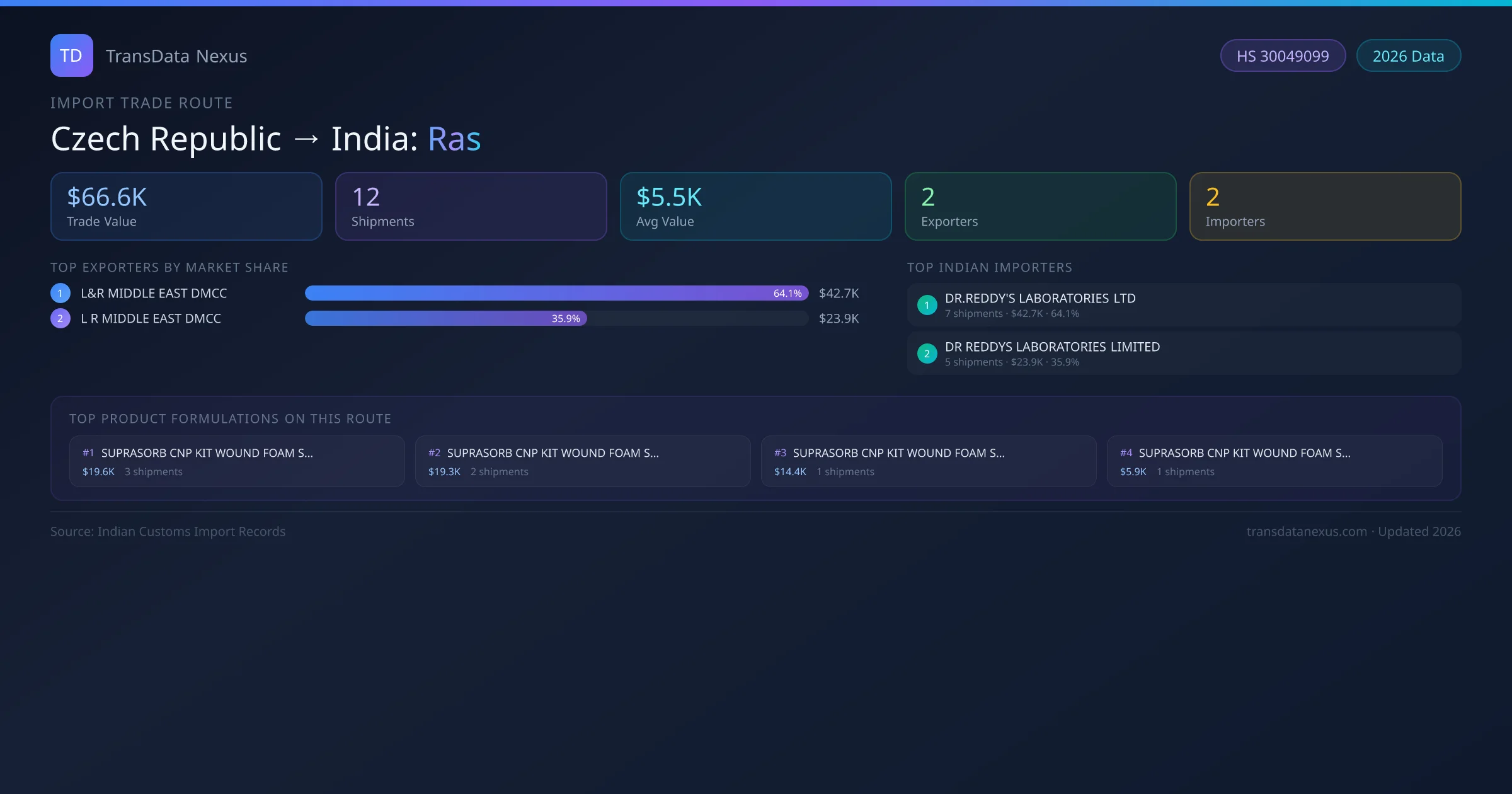 India has recorded 12 verified shipments of Ras imported from Czech Republic, representing a combined trade value of $66.6K USD. This corridor is served by 2 active Czech Republic exporters, with an average shipment value of $5.5K USD. The leading Czech Republic supplier is L&R MIDDLE EAST DMCC, which accounts for 64% of total import value with 7 shipments worth $42.7K USD. On the buying side, DR.REDDY'S LABORATORIES LTD is the largest Indian importer with $42.7K USD in purchases. All data sourced from Indian Customs (DGFT) shipping bill of entry records. Values reported in FOB USD.