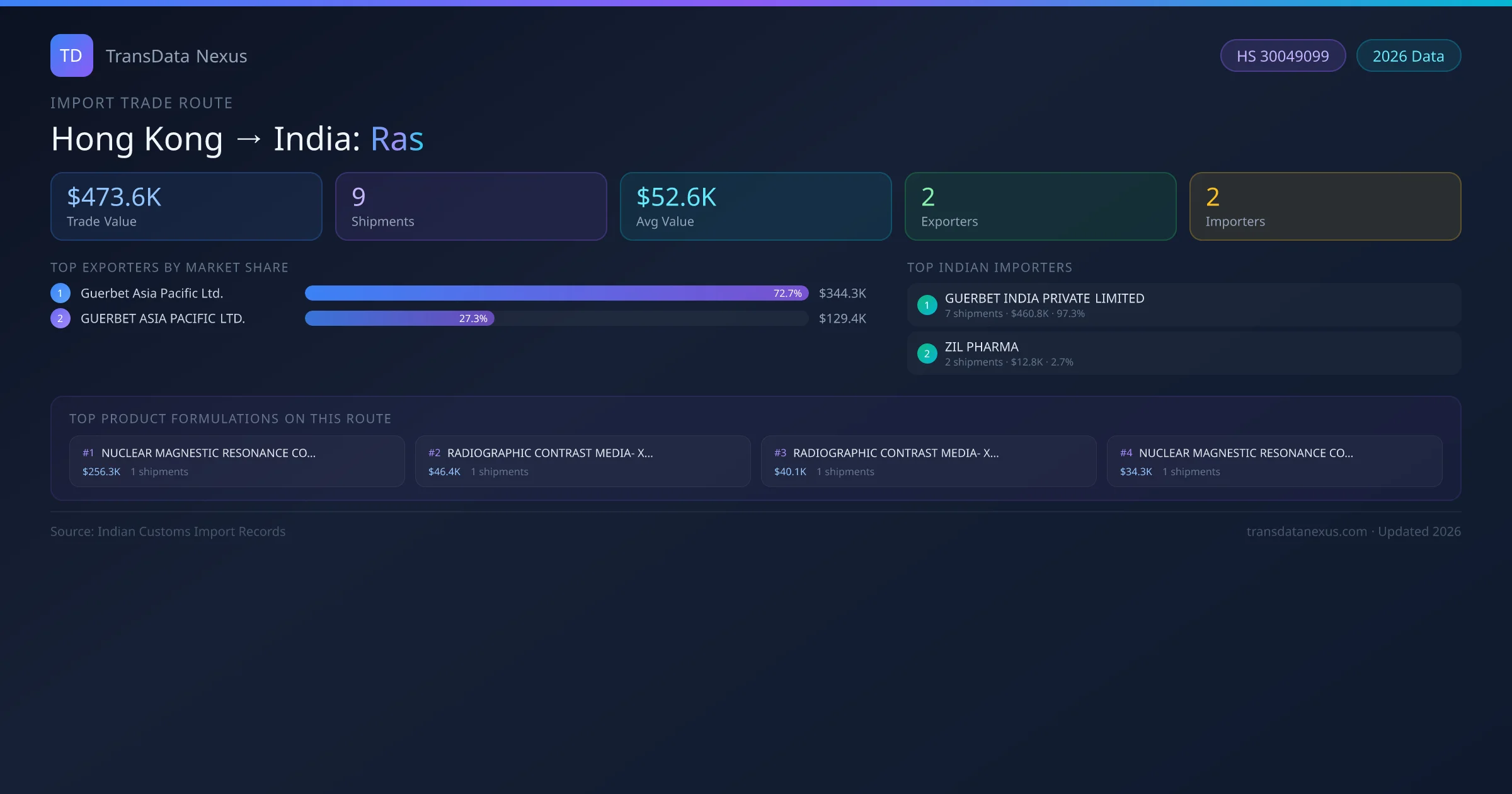 The Hong Kong to India Ras corridor is one of India's established pharmaceutical import routes from Hong Kong, with 9 shipments documented worth a combined $473.6K USD. The route is dominated by Guerbet Asia Pacific Ltd., which alone accounts for roughly 73% of all import value, reflecting the consolidated nature of Hong Kong's ras export sector.