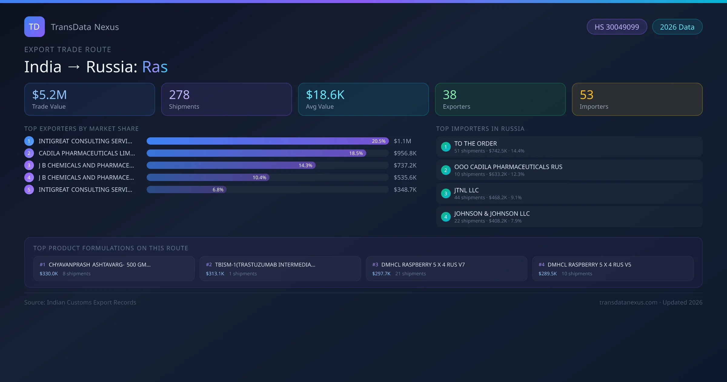 The India to Russia Ras corridor is one of India's established pharmaceutical export routes, with 278 shipments documented worth a combined $5.2M USD. The route is dominated by INTIGREAT CONSULTING SERVICES LLP, which alone accounts for roughly 20% of all export value, reflecting the consolidated nature of India's ras manufacturing sector.