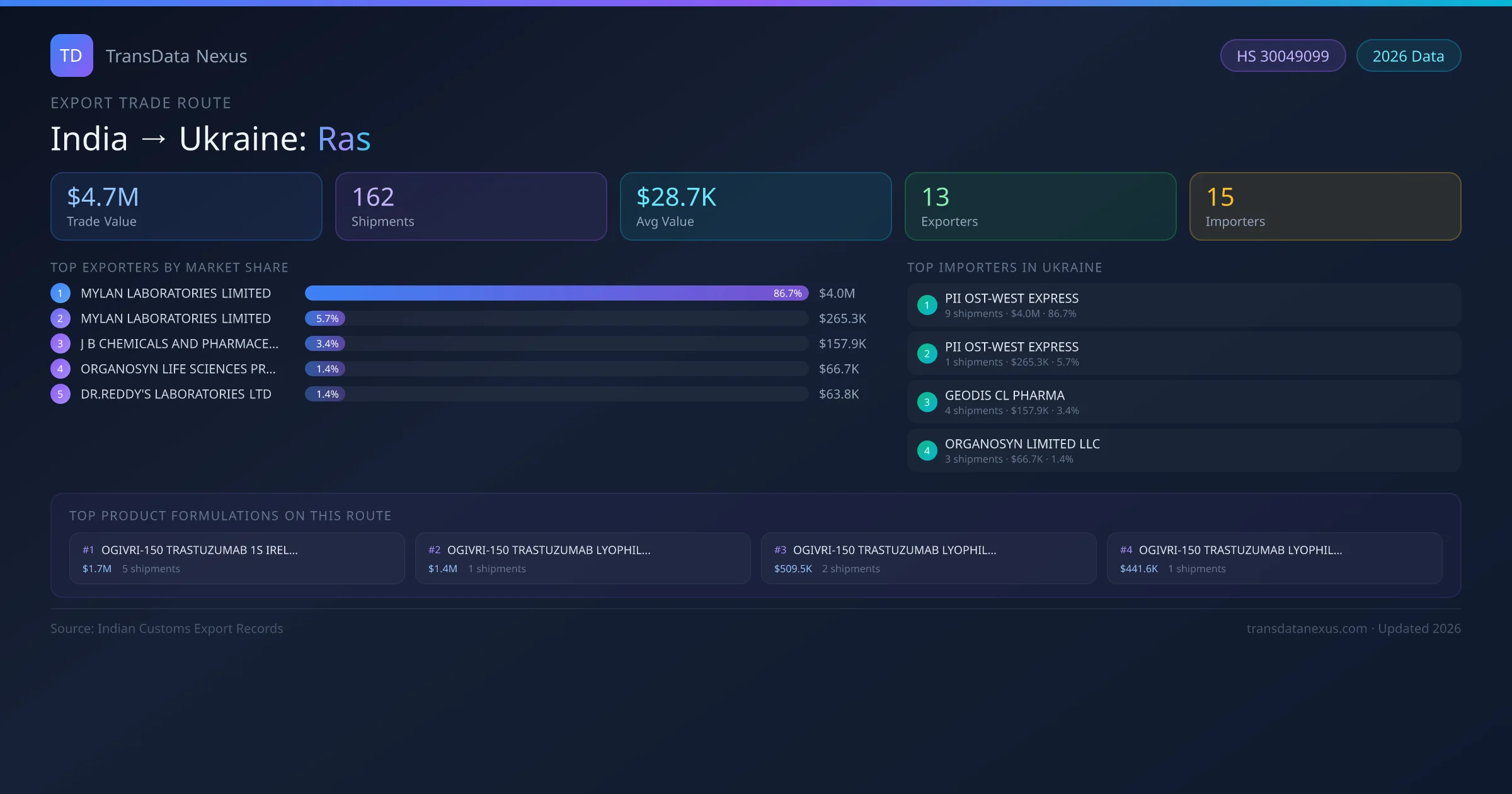 India has recorded 162 verified shipments of Ras exported to Ukraine, representing a combined trade value of $4.7M USD. This corridor is served by 13 active Indian exporters, with an average shipment value of $28.7K USD. The leading Indian exporter is MYLAN LABORATORIES LIMITED, which accounts for 87% of total export value with 9 shipments worth $4.0M USD. On the buying side, PII OST-WEST EXPRESS is the largest importer in Ukraine with $4.0M USD in purchases. The top 3 suppliers — MYLAN LABORATORIES LIMITED, MYLAN LABORATORIES LIMITED , J B CHEMICALS AND PHARMACEUTICALS LIMITED — together control 96% of total trade value on this route. All data sourced from Indian Customs (DGFT) shipping bill records. Values reported in FOB USD.