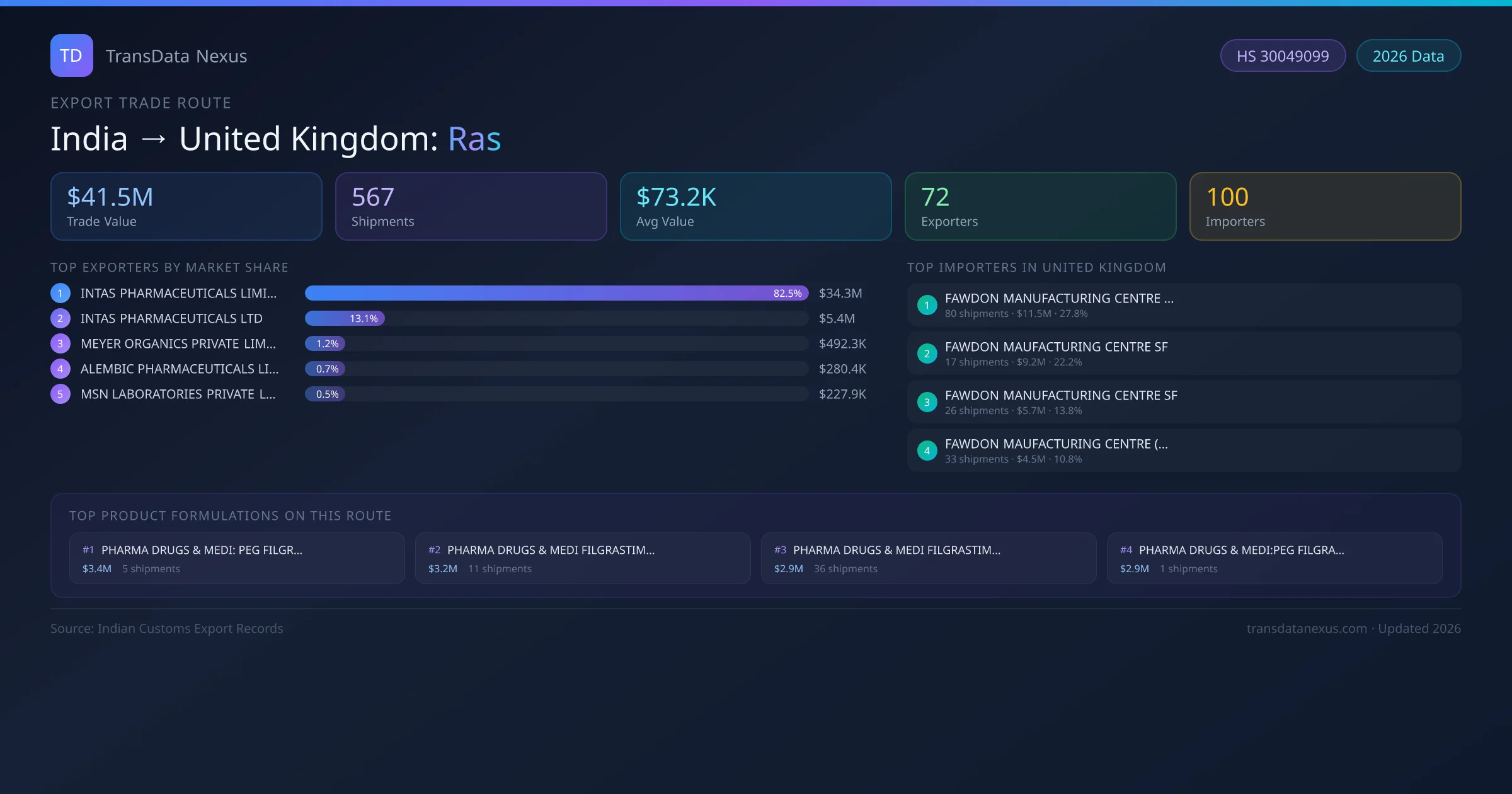 India has recorded 567 verified shipments of Ras exported to United Kingdom, representing a combined trade value of $41.5M USD. This corridor is served by 72 active Indian exporters, with an average shipment value of $73.2K USD. The leading Indian exporter is INTAS PHARMACEUTICALS LIMITED, which accounts for 83% of total export value with 246 shipments worth $34.3M USD. On the buying side, FAWDON MANUFACTURING CENTRE ( SF ) is the largest importer in United Kingdom with $11.5M USD in purchases. The top 3 suppliers — INTAS PHARMACEUTICALS LIMITED, INTAS PHARMACEUTICALS LTD, MEYER ORGANICS PRIVATE LIMITED — together control 97% of total trade value on this route. All data sourced from Indian Customs (DGFT) shipping bill records. Values reported in FOB USD.