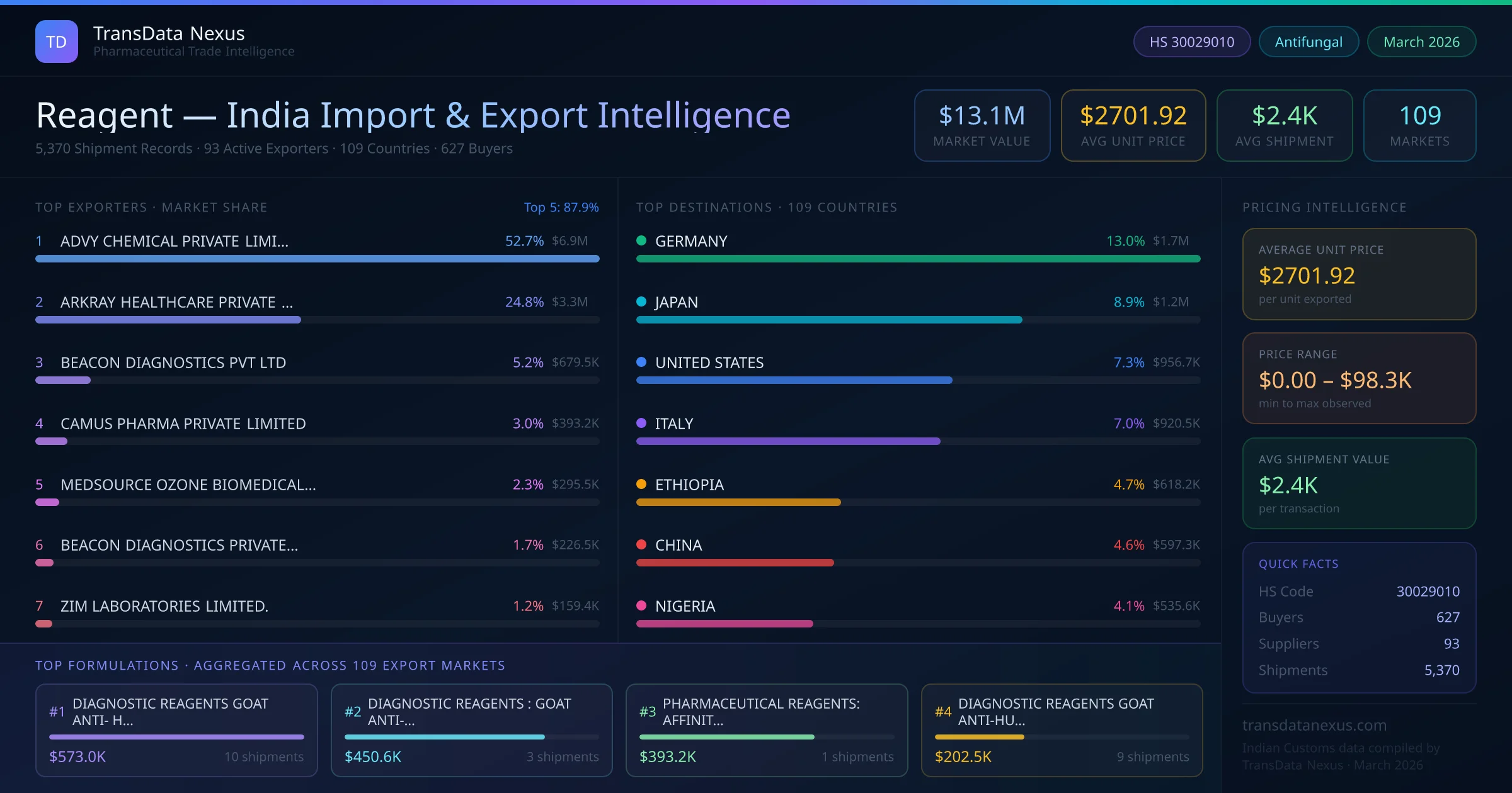 The total export value of reagent from India is $13.1M, recorded across 5,370 shipments from 93 active exporters to 109 countries. The average shipment value is $2.4K.