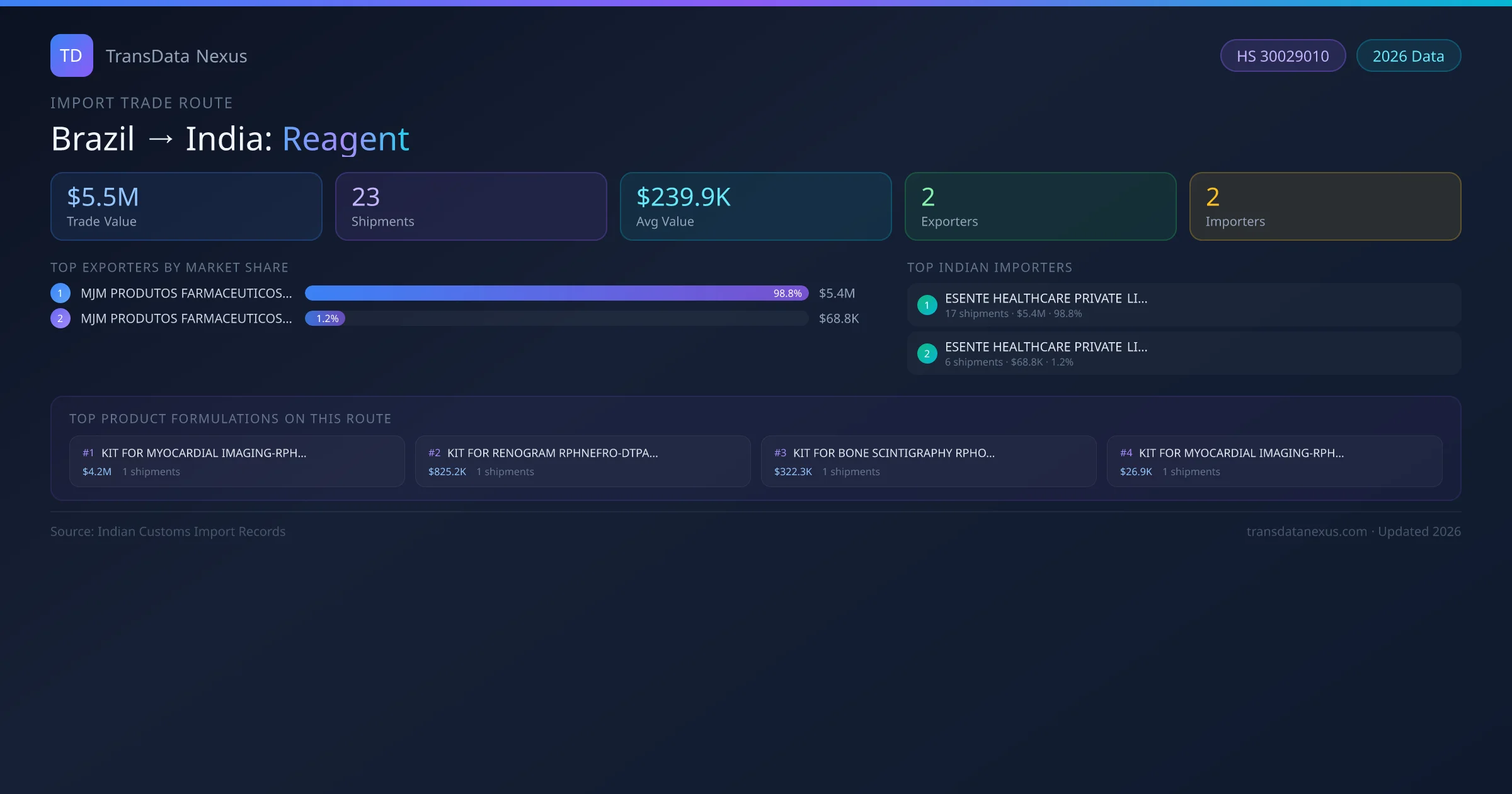 The Brazil to India Reagent corridor is one of India's established pharmaceutical import routes from Brazil, with 23 shipments documented worth a combined $5.5M USD. The route is dominated by MJM PRODUTOS FARMACEUTICOS E DE , which alone accounts for roughly 99% of all import value, reflecting the consolidated nature of Brazil's reagent export sector.