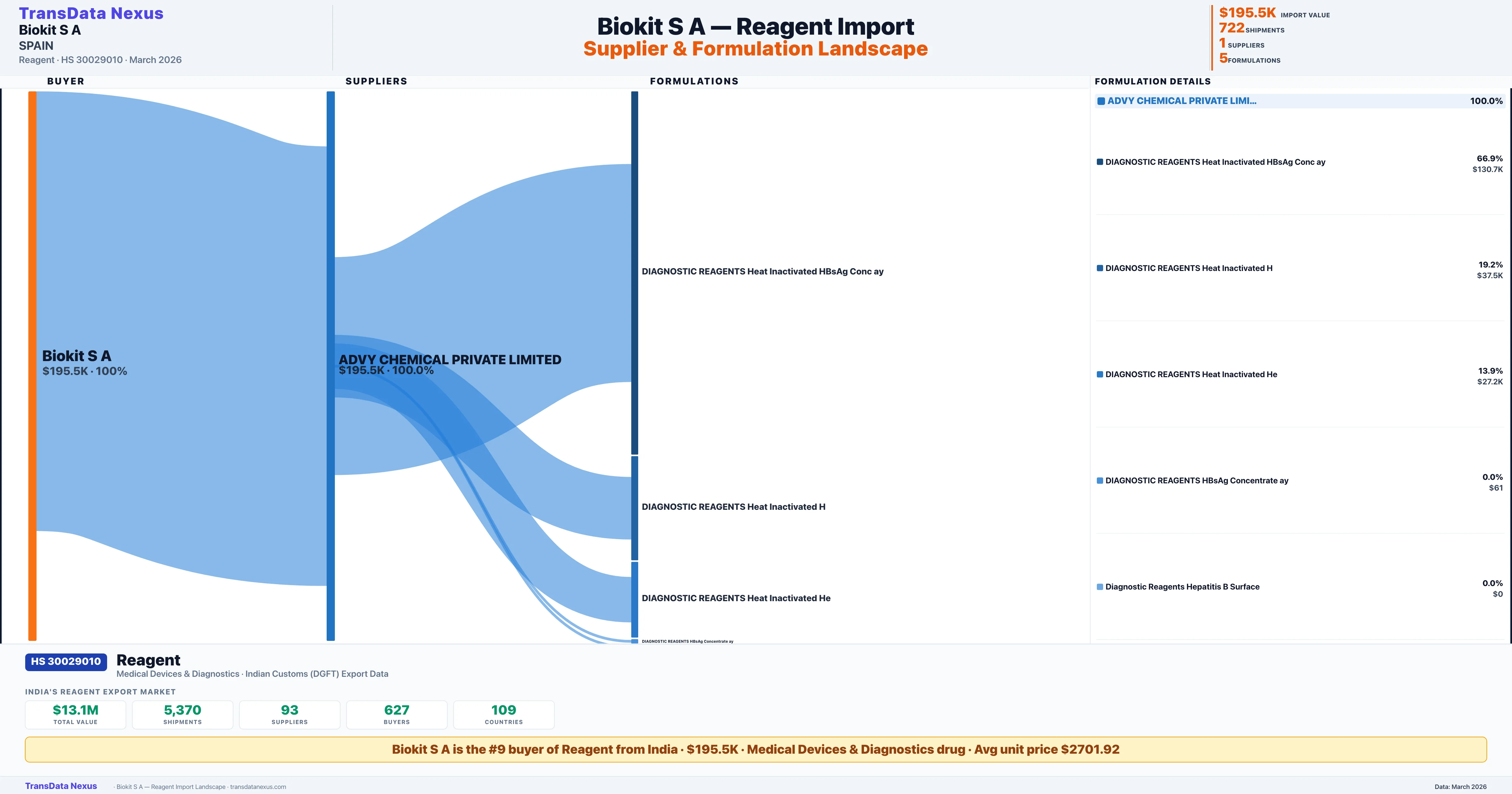 BIOKIT S A sources Reagent from 1 verified Indian supplier: ADVY CHEMICAL PRIVATE LIMITED ($195.5K, 100.0%). This is based on 722 customs records.
