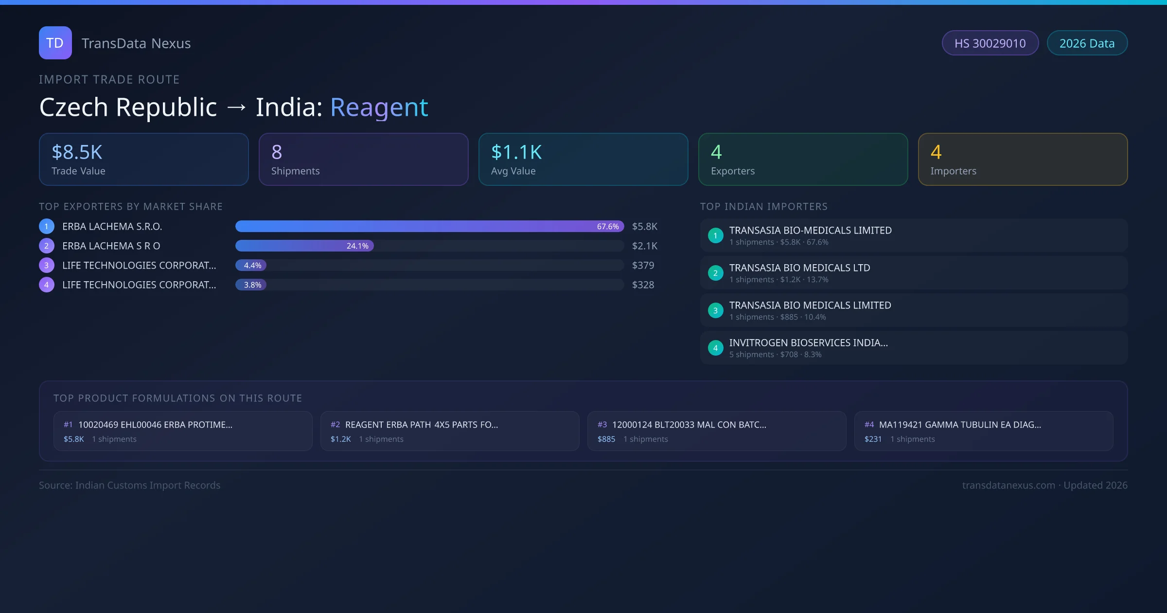 India has recorded 8 verified shipments of Reagent imported from Czech Republic, representing a combined trade value of $8.5K USD. This corridor is served by 4 active Czech Republic exporters, with an average shipment value of $1.1K USD. The leading Czech Republic supplier is ERBA LACHEMA S.R.O., which accounts for 68% of total import value with 1 shipments worth $5.8K USD. On the buying side, TRANSASIA BIO-MEDICALS LIMITED is the largest Indian importer with $5.8K USD in purchases. The top 3 suppliers — ERBA LACHEMA S.R.O., ERBA LACHEMA S R O, LIFE TECHNOLOGIES CORPORATION — together control 96% of total trade value on this route. All data sourced from Indian Customs (DGFT) shipping bill of entry records. Values reported in FOB USD.