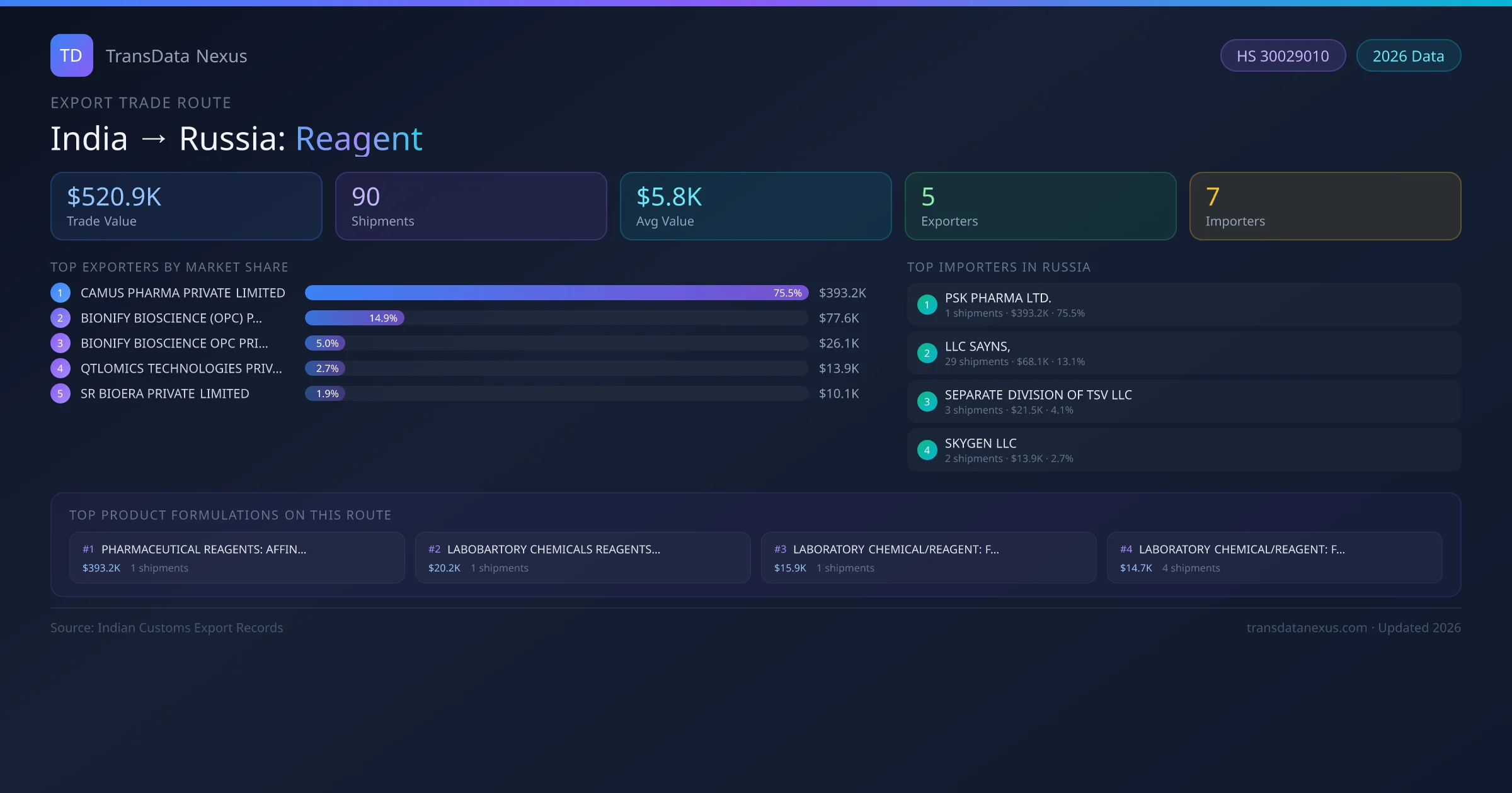 India has recorded 90 verified shipments of Reagent exported to Russia, representing a combined trade value of $520.9K USD. This corridor is served by 5 active Indian exporters, with an average shipment value of $5.8K USD. The leading Indian exporter is CAMUS PHARMA PRIVATE LIMITED, which accounts for 75% of total export value with 1 shipments worth $393.2K USD. On the buying side, PSK PHARMA LTD. is the largest importer in Russia with $393.2K USD in purchases. The top 3 suppliers — CAMUS PHARMA PRIVATE LIMITED, BIONIFY BIOSCIENCE (OPC) PRIVATE LIMITED, BIONIFY BIOSCIENCE OPC PRIVATE LIMITED — together control 95% of total trade value on this route. All data sourced from Indian Customs (DGFT) shipping bill records. Values reported in FOB USD.
