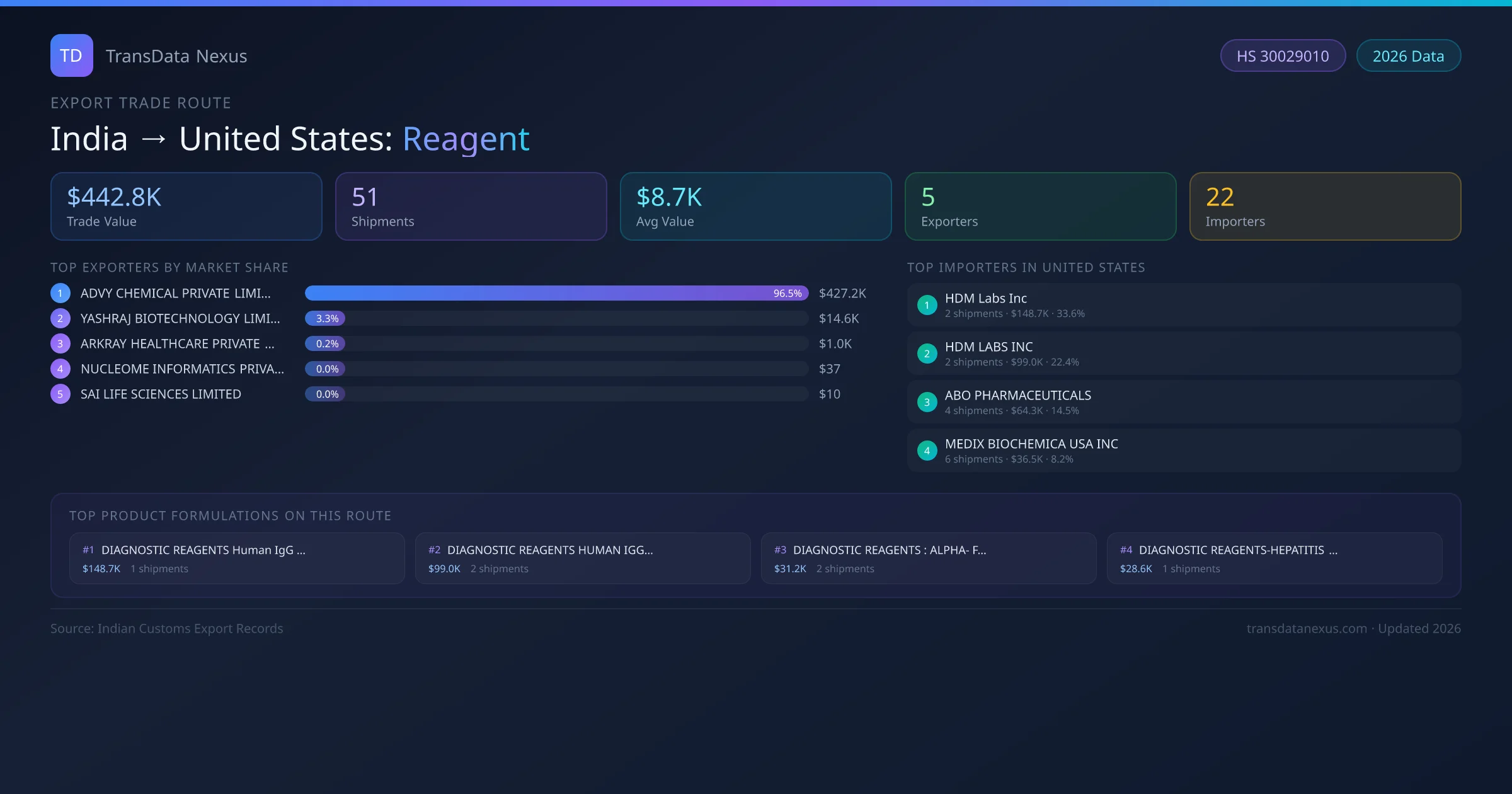 India exports Reagent to United States worth approximately $442.8K USD across 51 recorded shipments. The average value per shipment is $8.7K USD.