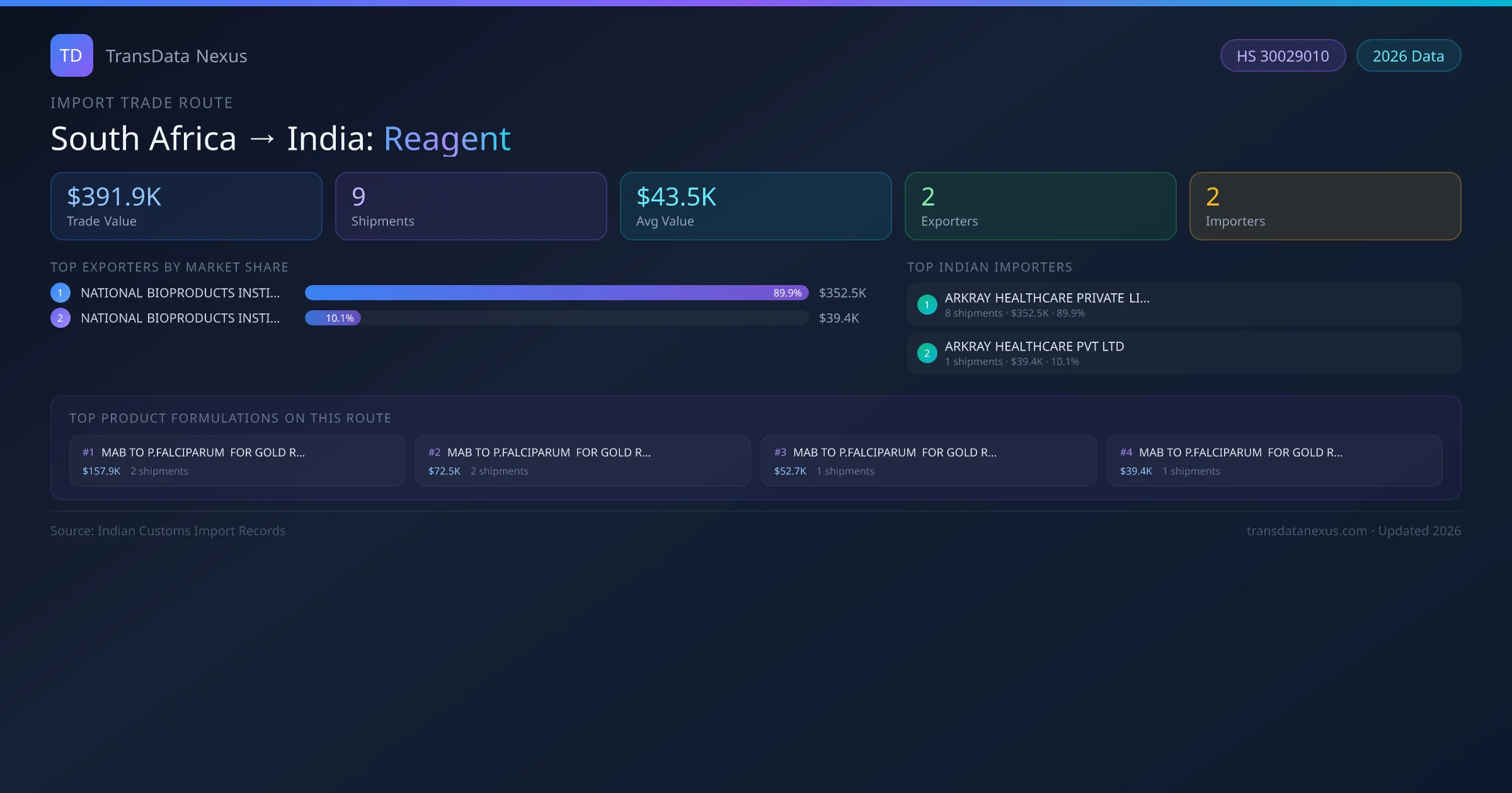 The South Africa to India Reagent corridor is one of India's established pharmaceutical import routes from South Africa, with 9 shipments documented worth a combined $391.9K USD. The route is dominated by NATIONAL BIOPRODUCTS INSTITUTE NPC , which alone accounts for roughly 90% of all import value, reflecting the consolidated nature of South Africa's reagent export sector.