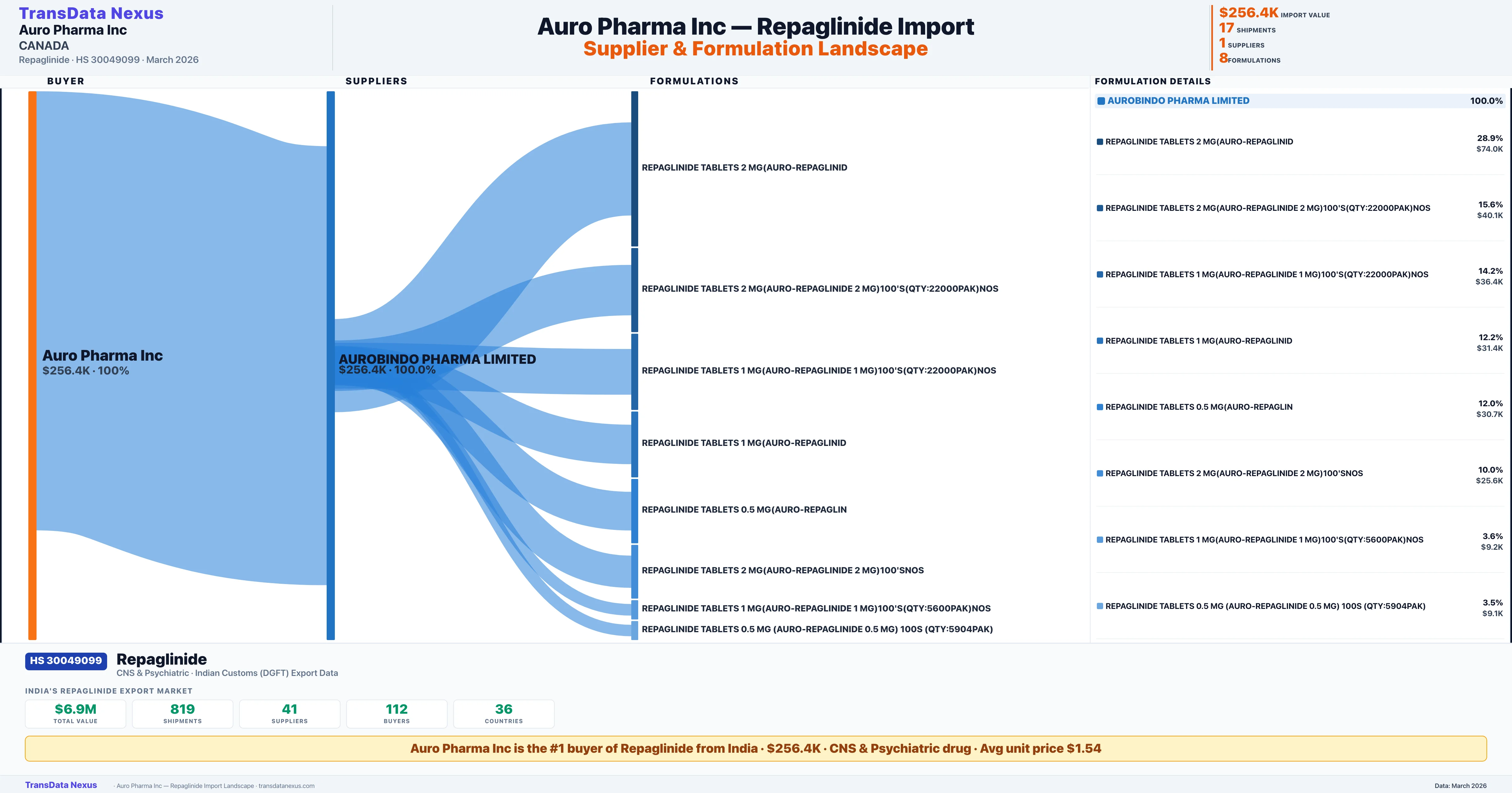 AURO PHARMA INC, sources Repaglinide from 1 verified Indian supplier: AUROBINDO PHARMA LIMITED ($256.4K, 100.0%). This is based on 17 customs records.