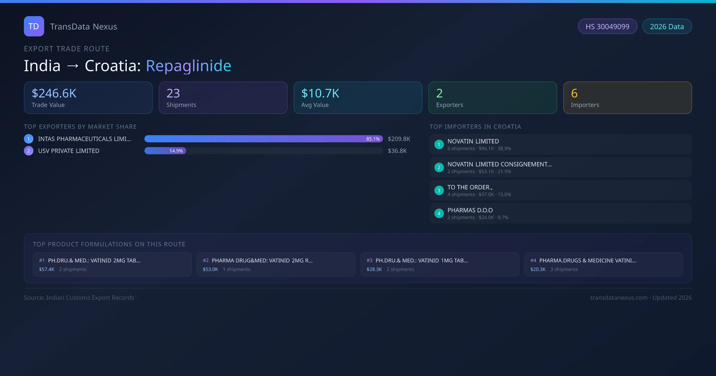 India exports Repaglinide to Croatia worth approximately $246.6K USD across 23 recorded shipments. The average value per shipment is $10.7K USD.