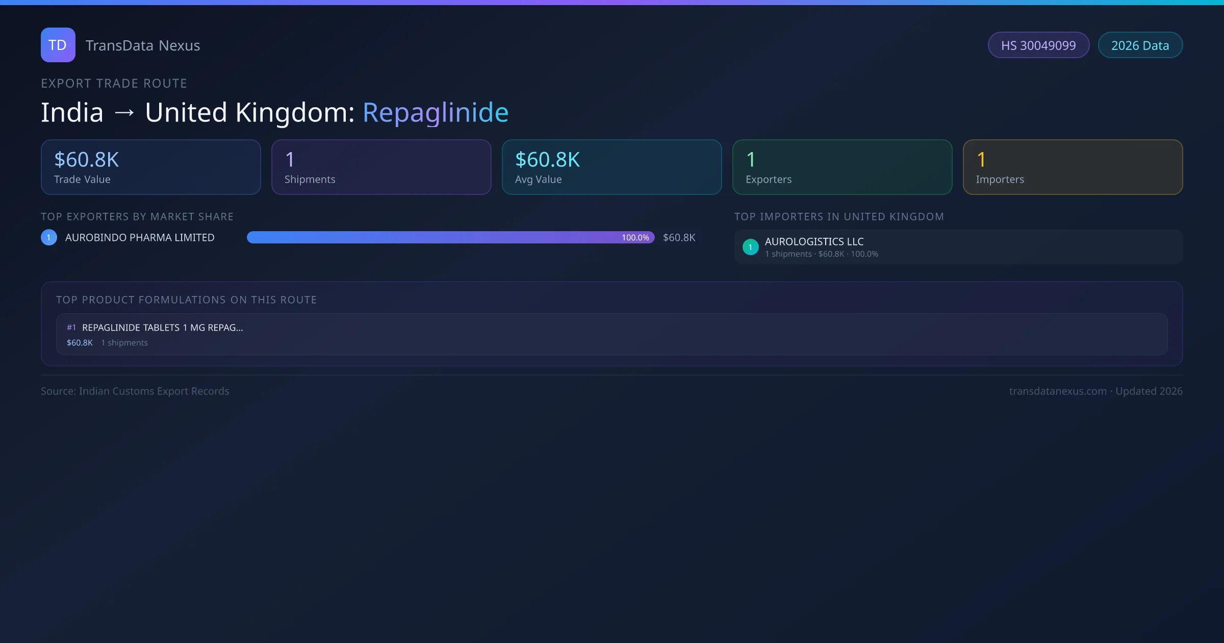 On the import side, key buyers of Indian repaglinide in United Kingdom include AUROLOGISTICS LLC. AUROLOGISTICS LLC is the single largest importer with 1 shipments valued at $60.8K USD.
