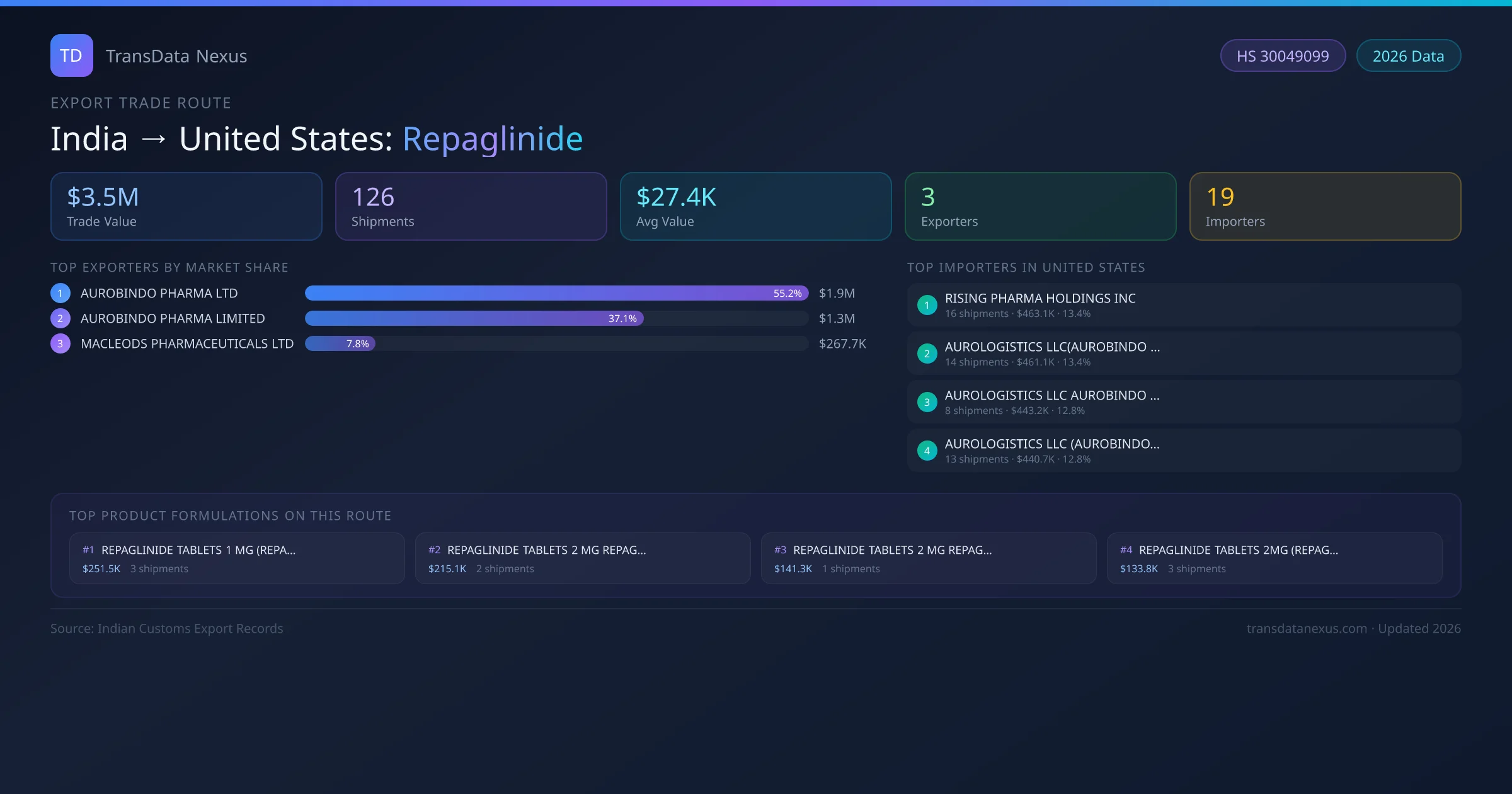 India exports Repaglinide to United States worth approximately $3.5M USD across 126 recorded shipments. The average value per shipment is $27.4K USD.