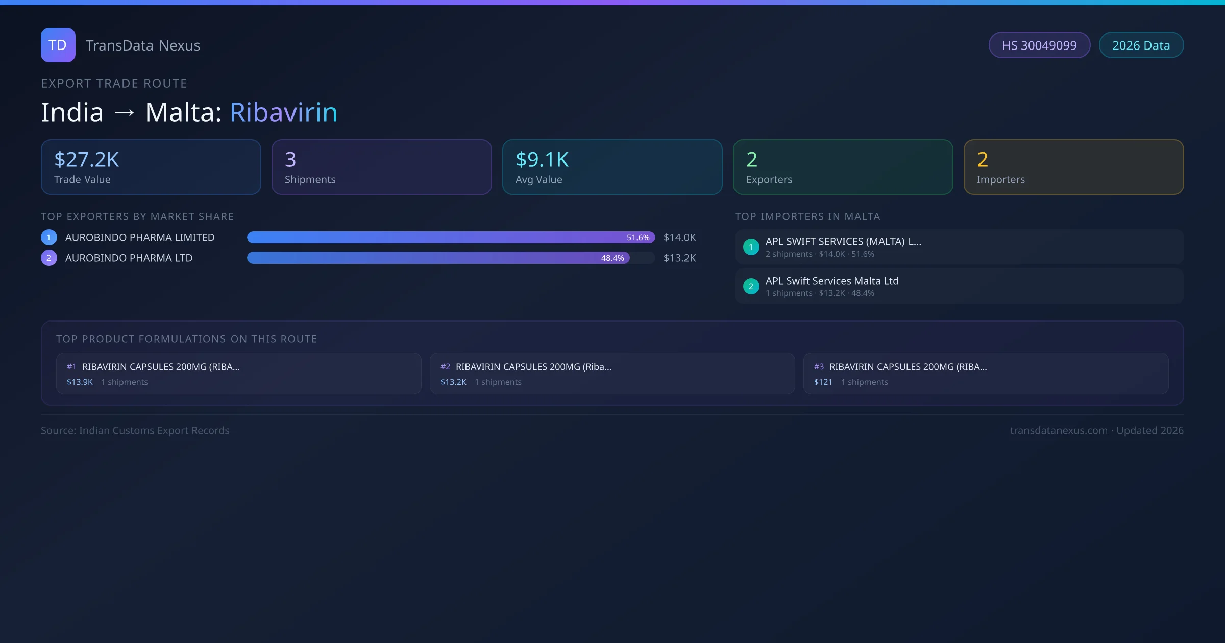 India exports Ribavirin to Malta worth approximately $27.2K USD across 3 recorded shipments. The average value per shipment is $9.1K USD.