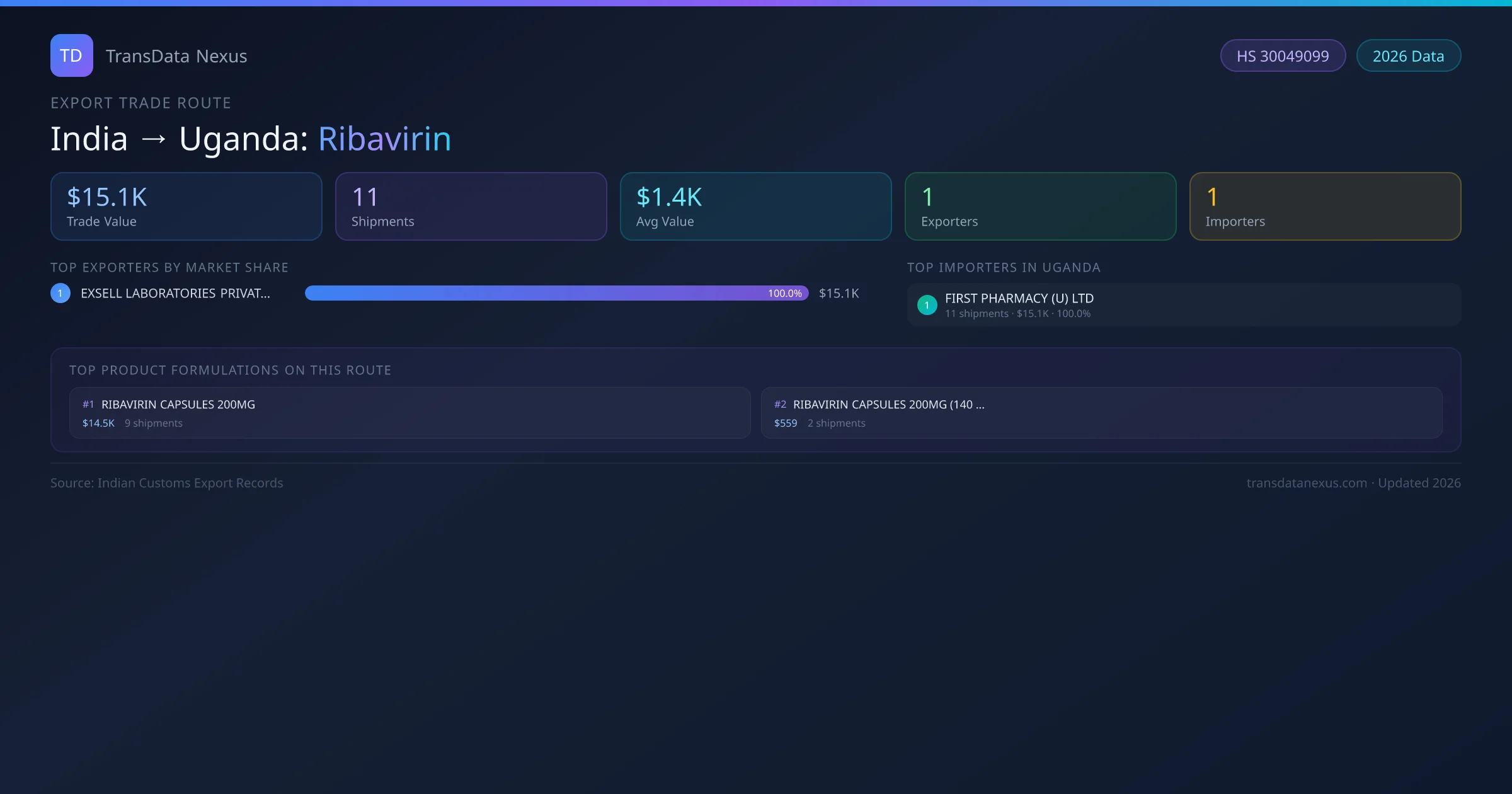 India has recorded 11 verified shipments of Ribavirin exported to Uganda, representing a combined trade value of $15.1K USD. This corridor is served by 1 active Indian exporters, with an average shipment value of $1.4K USD. The leading Indian exporter is EXSELL LABORATORIES PRIVATE LIMITED , which accounts for 100% of total export value with 11 shipments worth $15.1K USD. On the buying side, FIRST PHARMACY (U) LTD is the largest importer in Uganda with $15.1K USD in purchases. All data sourced from Indian Customs (DGFT) shipping bill records. Values reported in FOB USD.
