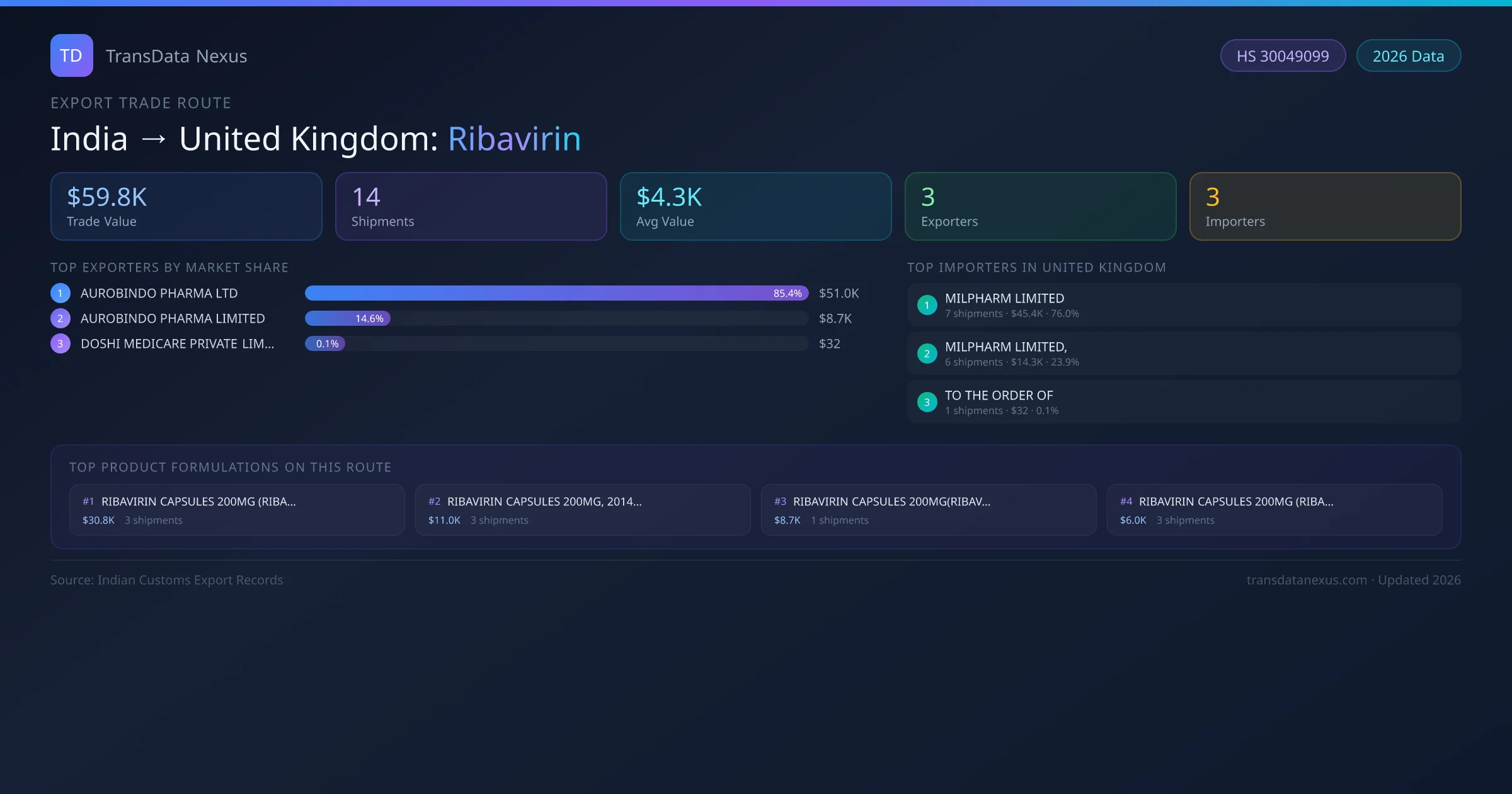 The India to United Kingdom Ribavirin corridor is one of India's established pharmaceutical export routes, with 14 shipments documented worth a combined $59.8K USD. The route is dominated by AUROBINDO PHARMA LTD, which alone accounts for roughly 85% of all export value, reflecting the consolidated nature of India's ribavirin manufacturing sector.