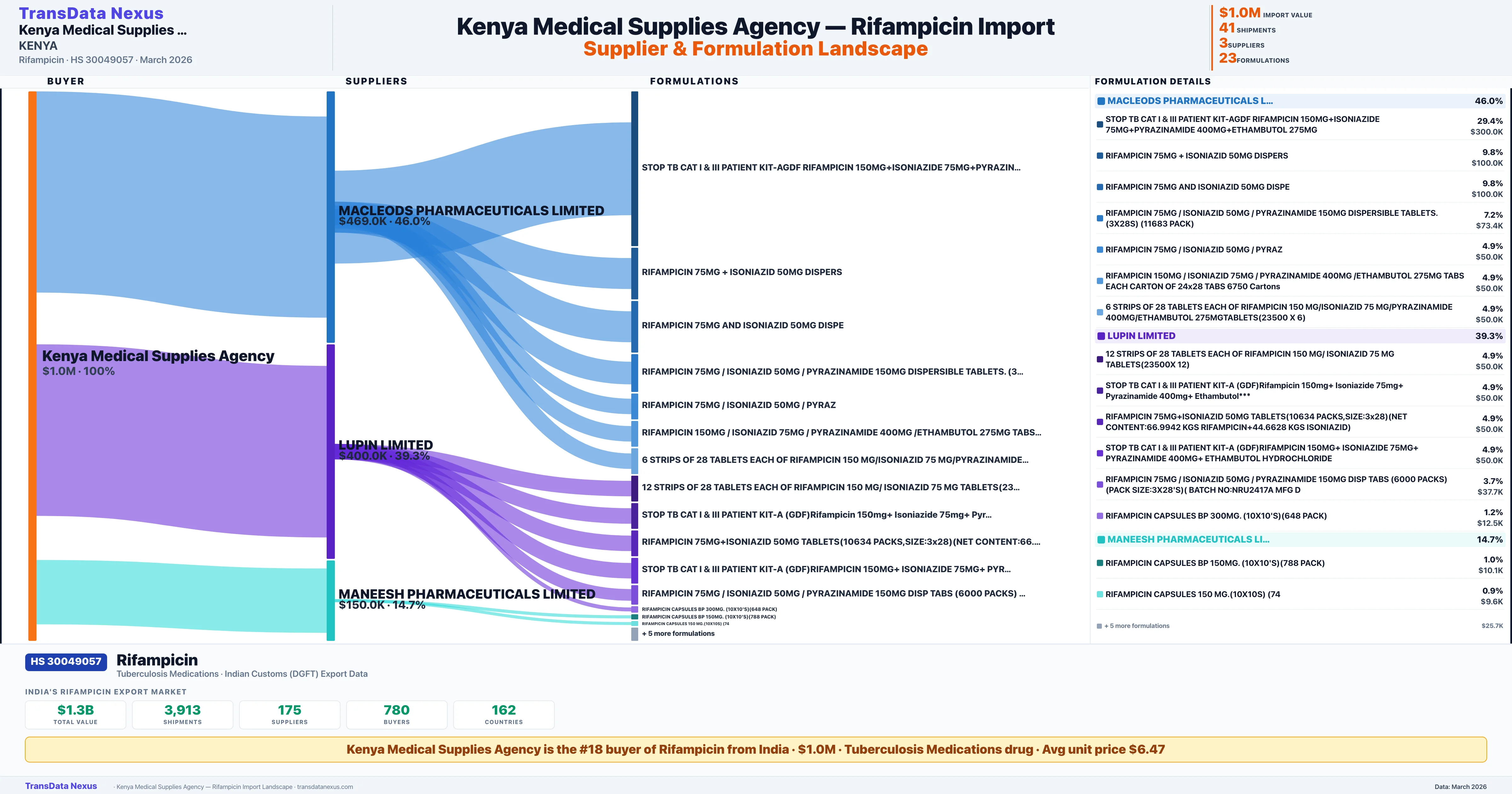 KENYA MEDICAL SUPPLIES AGENCY sources Rifampicin from 3 verified Indian suppliers: MACLEODS PHARMACEUTICALS LIMITED ($469.0K, 46.0%), LUPIN LIMITED ($400.0K, 39.3%), MANEESH PHARMACEUTICALS LIMITED ($150.0K, 14.7%). This is based on 41 customs records.