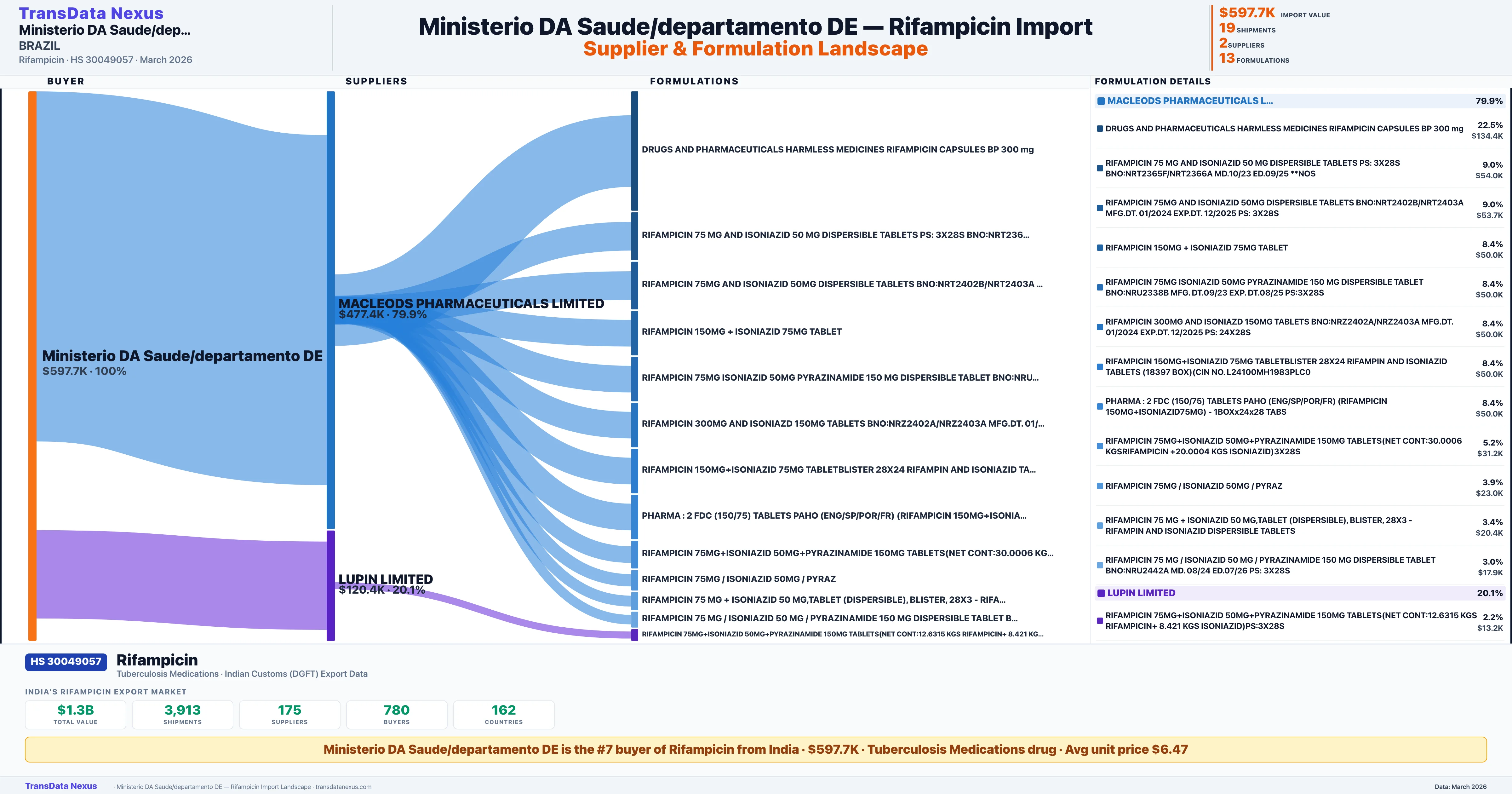 MINISTERIO DA SAUDE/DEPARTAMENTO DE sources Rifampicin from 2 verified Indian suppliers based on 19 customs records. The primary supplier is MACLEODS PHARMACEUTICALS LIMITED accounting for 79.9% of imports.