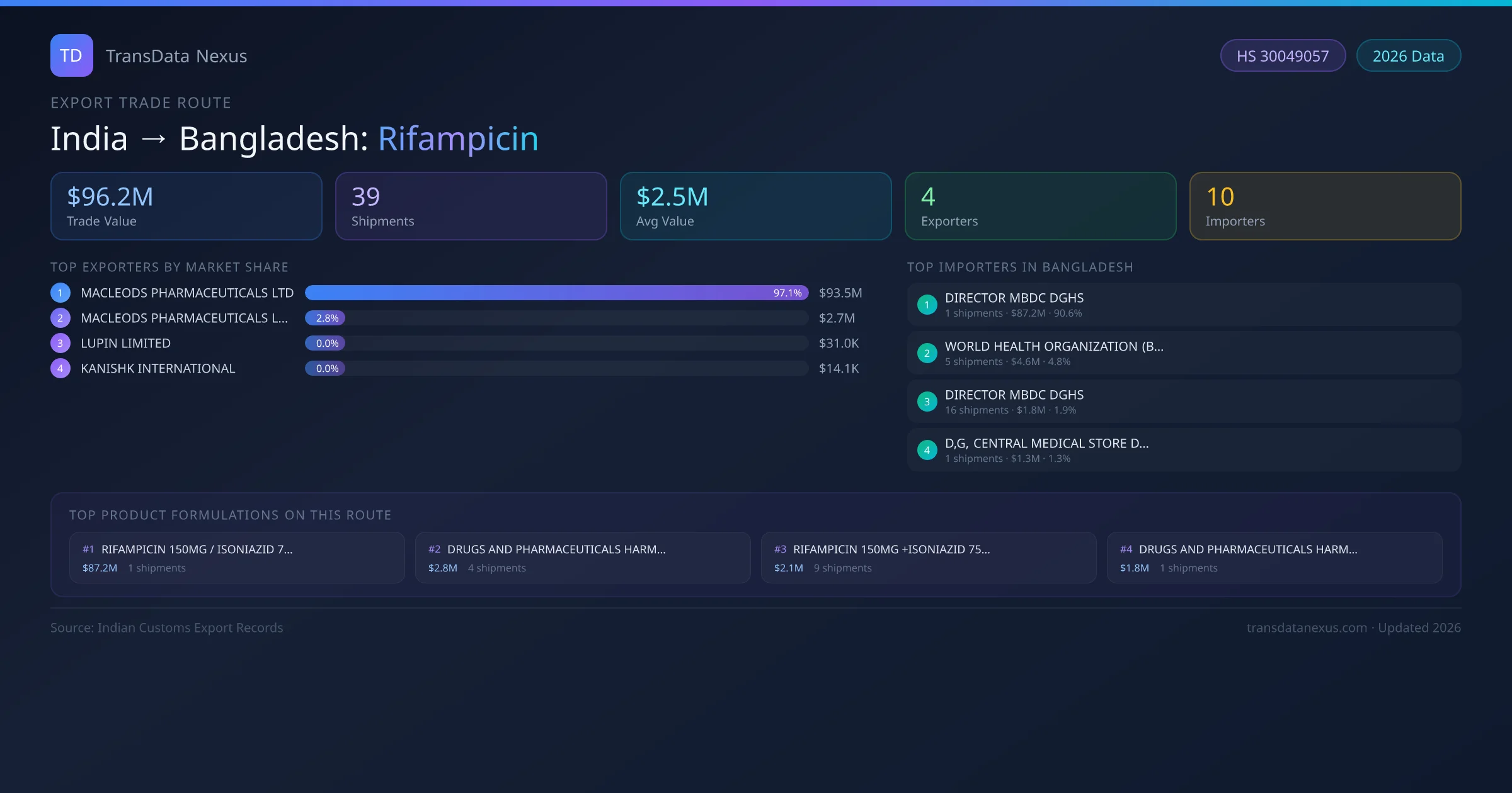 India has recorded 39 verified shipments of Rifampicin exported to Bangladesh, representing a combined trade value of $96.2M USD. This corridor is served by 4 active Indian exporters, with an average shipment value of $2.5M USD. The leading Indian exporter is MACLEODS PHARMACEUTICALS LTD, which accounts for 97% of total export value with 14 shipments worth $93.5M USD. On the buying side, DIRECTOR MBDC DGHS is the largest importer in Bangladesh with $87.2M USD in purchases. The top 3 suppliers — MACLEODS PHARMACEUTICALS LTD, MACLEODS PHARMACEUTICALS LTD , LUPIN LIMITED — together control 100% of total trade value on this route. All data sourced from Indian Customs (DGFT) shipping bill records. Values reported in FOB USD.
