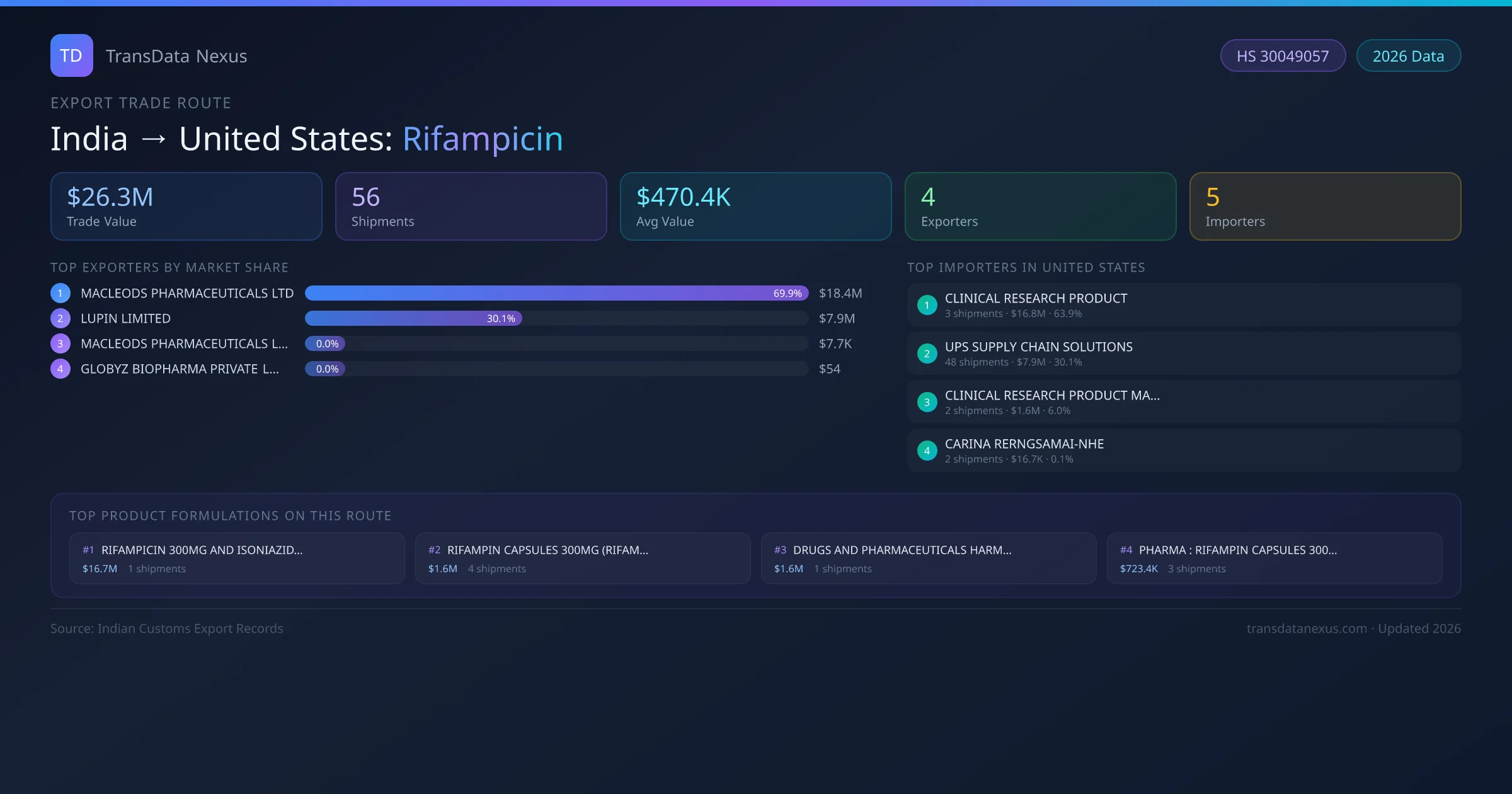 The India to United States Rifampicin corridor is one of India's established pharmaceutical export routes, with 56 shipments documented worth a combined $26.3M USD. The route is dominated by MACLEODS PHARMACEUTICALS LTD, which alone accounts for roughly 70% of all export value, reflecting the consolidated nature of India's rifampicin manufacturing sector.