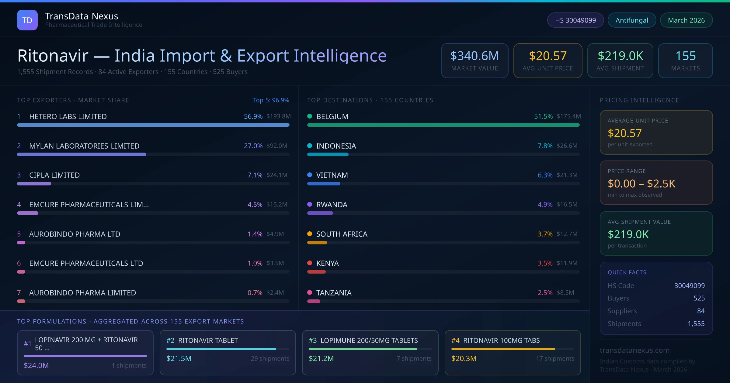Between 2022 and 2026, India exported $340.6M worth of ritonavir across 1,555 verified shipments to 155 countries — covering 79% of world markets in the Antiviral & HIV Medications segment. The largest destination is BELGIUM (51.5%). HETERO LABS LIMITED leads with a 56.9% share. All figures are drawn from Indian Customs (DGFT) shipping bill records spanning four years of trade activity.