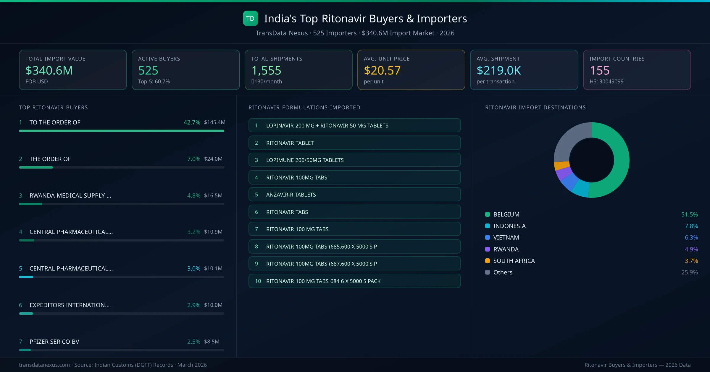 Ritonavir buyer data β 525 importers Β· $340.6M market Β· 1,555 shipmentsTransData Nexus Β· Indian Customs Data