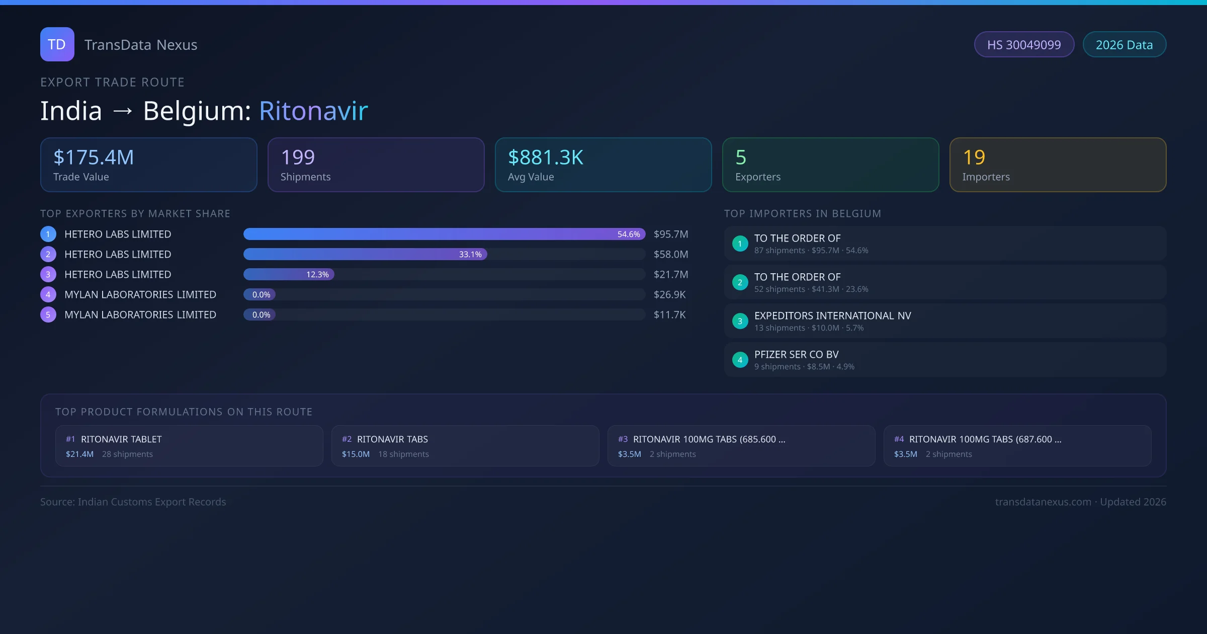 India exports Ritonavir to Belgium worth approximately $175.4M USD across 199 recorded shipments. The average value per shipment is $881.3K USD.