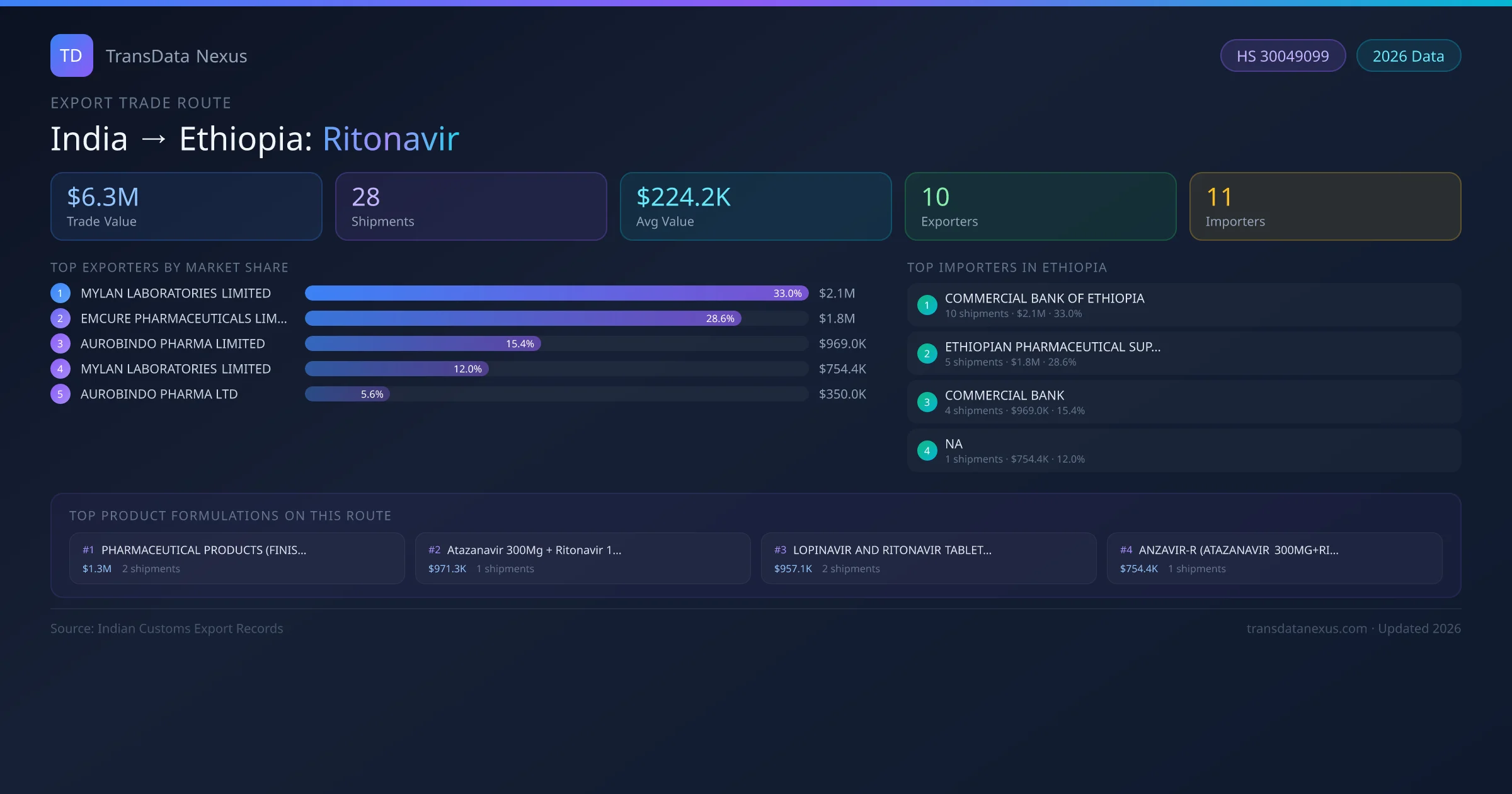 India has recorded 28 verified shipments of Ritonavir exported to Ethiopia, representing a combined trade value of $6.3M USD. This corridor is served by 10 active Indian exporters, with an average shipment value of $224.2K USD. The leading Indian exporter is MYLAN LABORATORIES LIMITED, which accounts for 33% of total export value with 10 shipments worth $2.1M USD. On the buying side, COMMERCIAL BANK OF ETHIOPIA is the largest importer in Ethiopia with $2.1M USD in purchases. The top 3 suppliers — MYLAN LABORATORIES LIMITED, EMCURE PHARMACEUTICALS LIMITED, AUROBINDO PHARMA LIMITED — together control 77% of total trade value on this route. All data sourced from Indian Customs (DGFT) shipping bill records. Values reported in FOB USD.