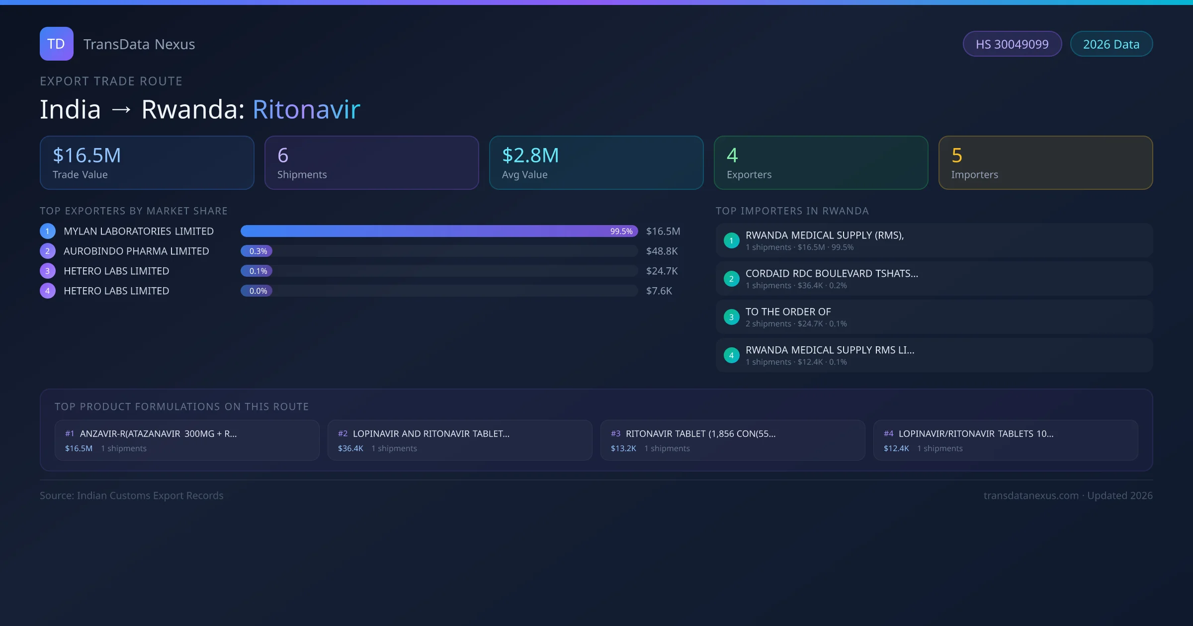 - 1.Route Identification: India to Rwanda export trade corridor identified from Indian Customs (DGFT) records for Ritonavir.