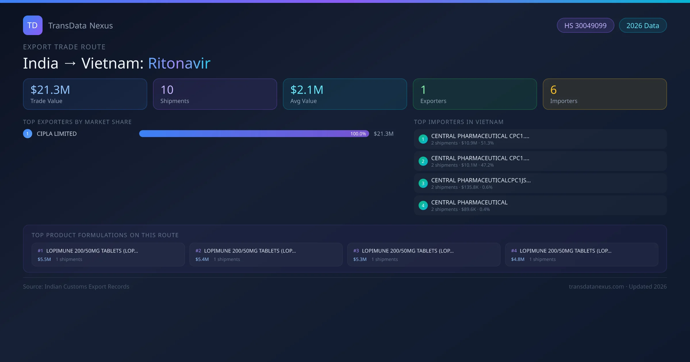 The leading Indian exporters of Ritonavir to Vietnam are CIPLA LIMITED. CIPLA LIMITED holds the largest market share at approximately 100% of total trade value on this route.