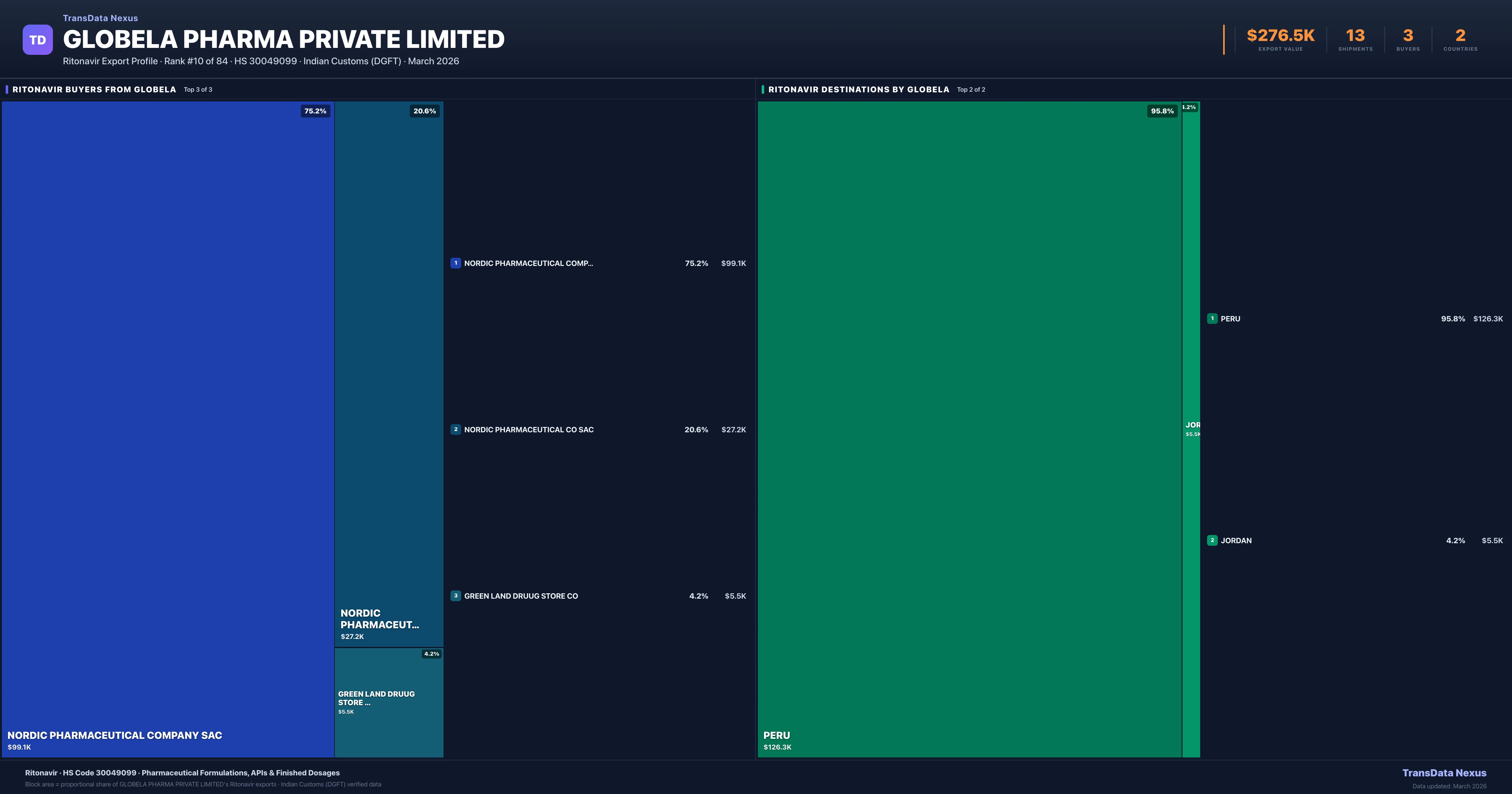 Globela Pharma Private Limited supplies Ritonavir to 3 buyers globally. The largest buyer is NORDIC PHARMACEUTICAL COMPANY SAC (PERU), followed by NORDIC PHARMACEUTICAL CO SAC (PERU) and GREEN LAND DRUUG STORE CO (JORDAN). These buyers represent pharmaceutical distributors, hospital groups, and government procurement agencies in their respective markets.