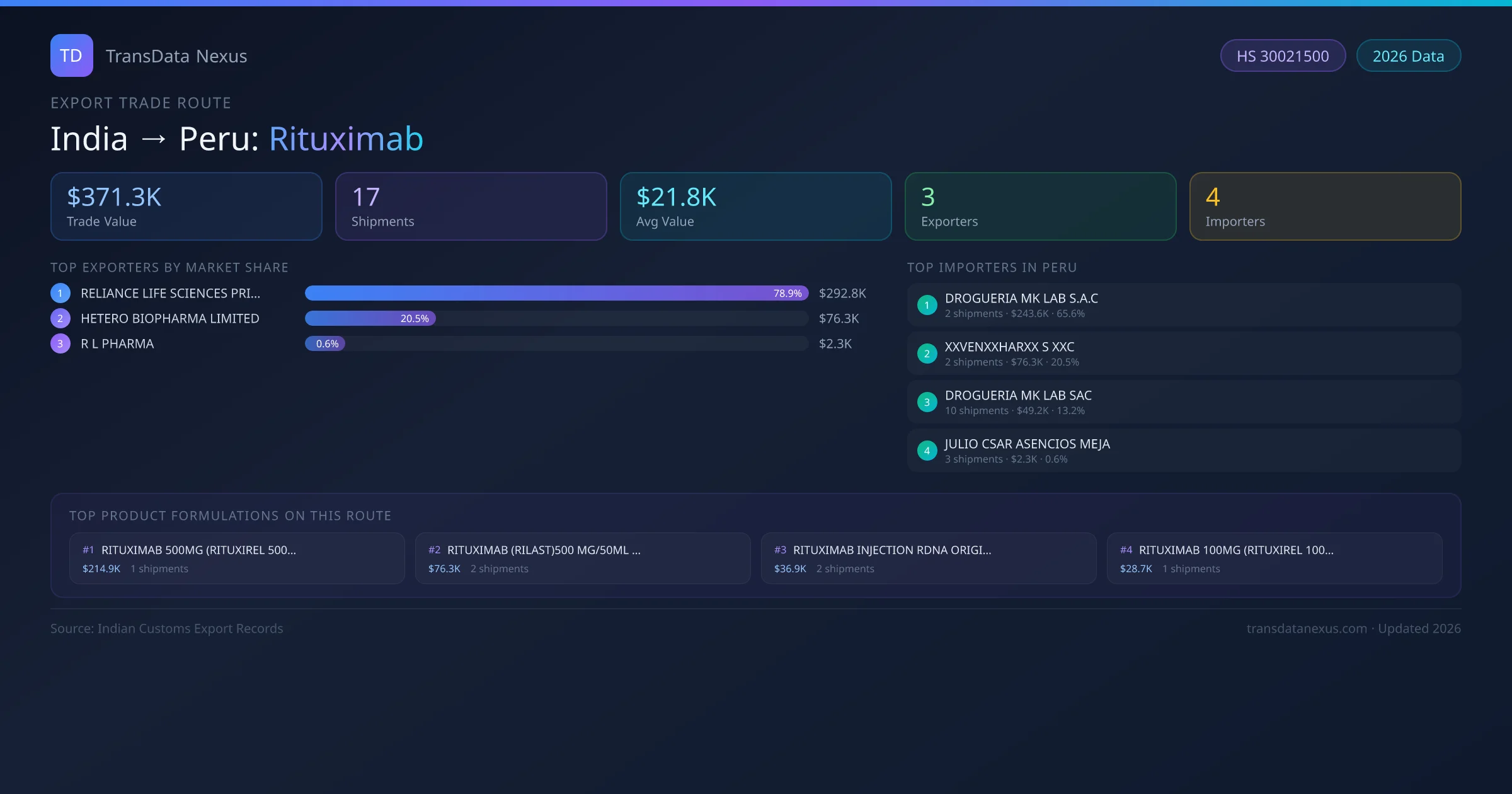- 1.Route Identification: India to Peru export trade corridor identified from Indian Customs (DGFT) records for Rituximab.