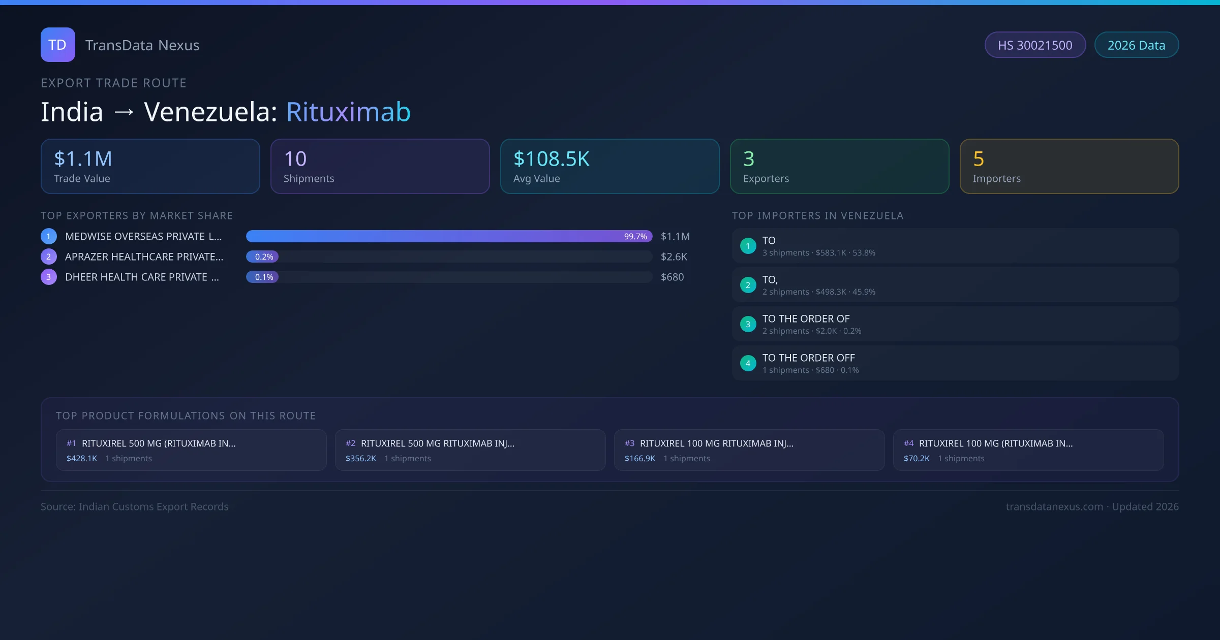 India has recorded 10 verified shipments of Rituximab exported to Venezuela, representing a combined trade value of $1.1M USD. This corridor is served by 3 active Indian exporters, with an average shipment value of $108.5K USD. The leading Indian exporter is MEDWISE OVERSEAS PRIVATE LIMITED, which accounts for 100% of total export value with 5 shipments worth $1.1M USD. On the buying side, TO is the largest importer in Venezuela with $583.1K USD in purchases. The top 3 suppliers — MEDWISE OVERSEAS PRIVATE LIMITED, APRAZER HEALTHCARE PRIVATE LIMITED, DHEER HEALTH CARE PRIVATE LIMITED — together control 100% of total trade value on this route. All data sourced from Indian Customs (DGFT) shipping bill records. Values reported in FOB USD.