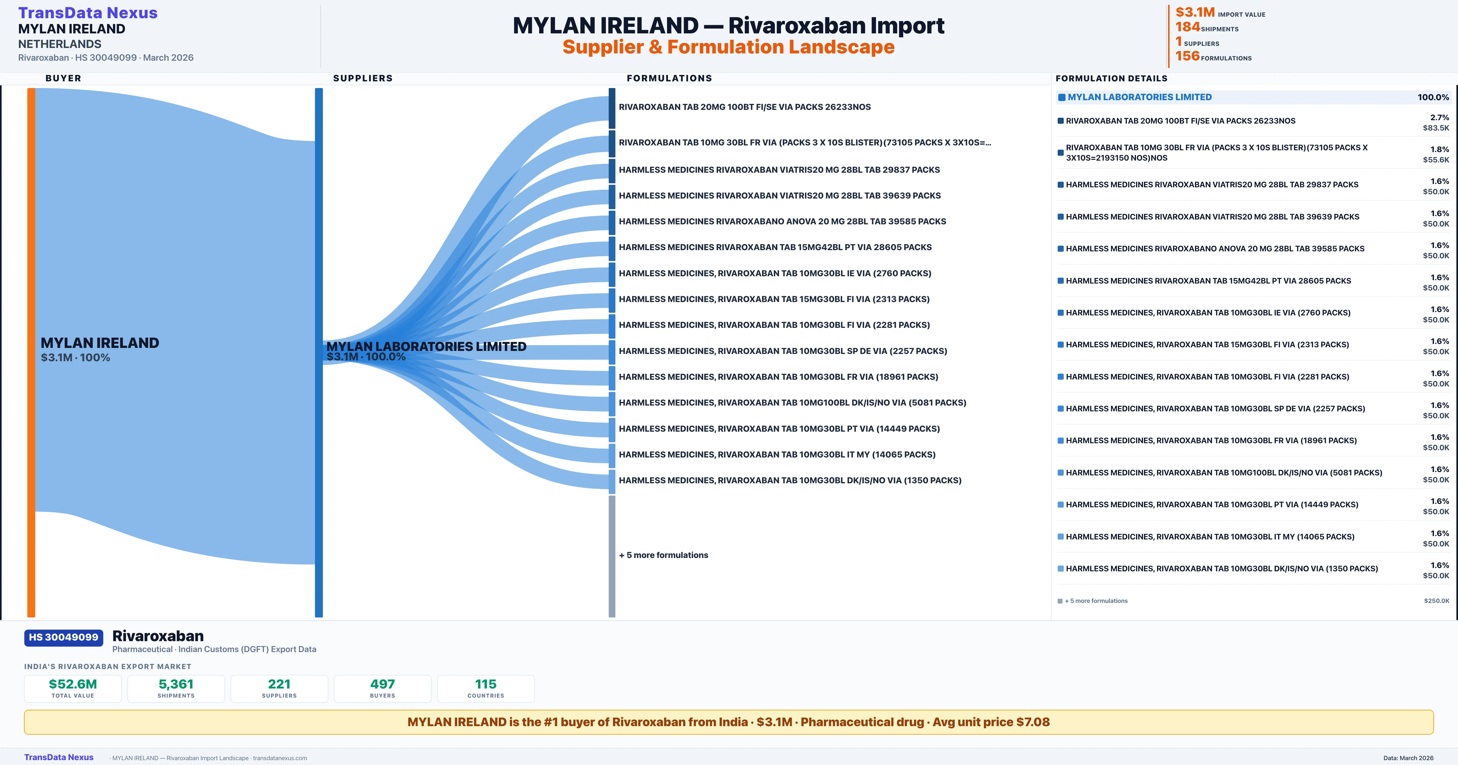 MYLAN IRELAND sources Rivaroxaban from 1 verified Indian supplier: MYLAN LABORATORIES LIMITED ($3.1M, 100.0%). This is based on 184 customs records.