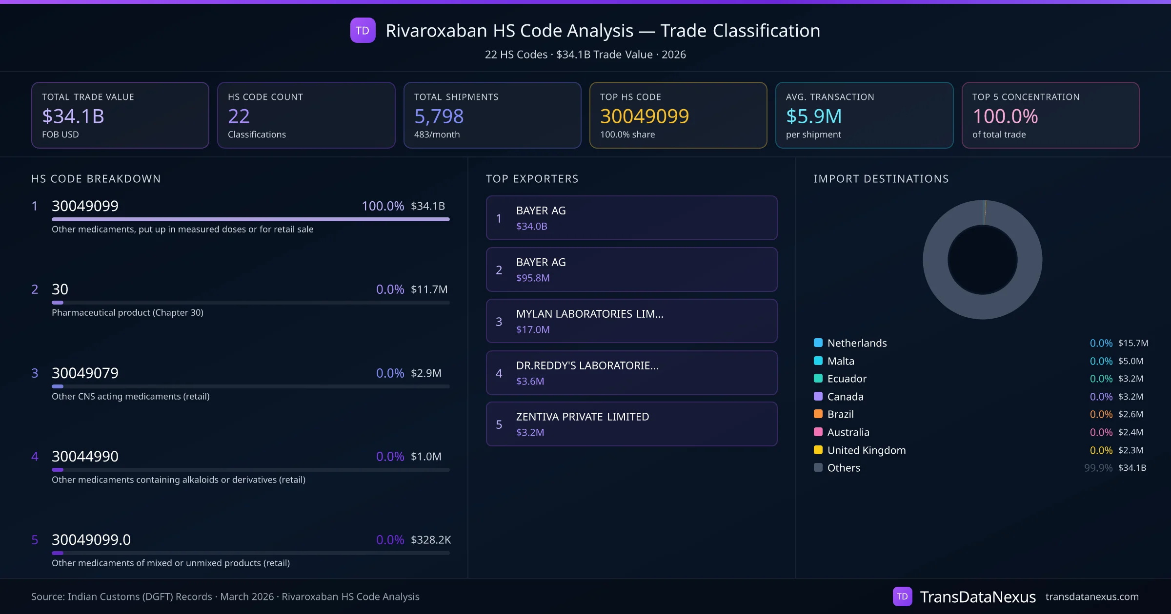 India exports Rivaroxaban under 22 distinct HS code classifications, representing a total trade value of $34.1B across 5,798 shipments. The dominant classification is HS 30049099 (Other medicaments, put up in measured doses or for retail sale), accounting for 100.0% of all Rivaroxaban trade at $34.1B. HS 30 (Pharmaceutical product (Chapter 30)) follows at 0.0% ($11.7M). The top 5 HS codes together account for 100.0% of total Rivaroxaban trade from India. The average transaction value is $5886732. Key importing markets include Netherlands, Malta, Ecuador. Leading exporters include BAYER AG and BAYER AG. Data sourced from Indian Customs (DGFT) shipping bill records.