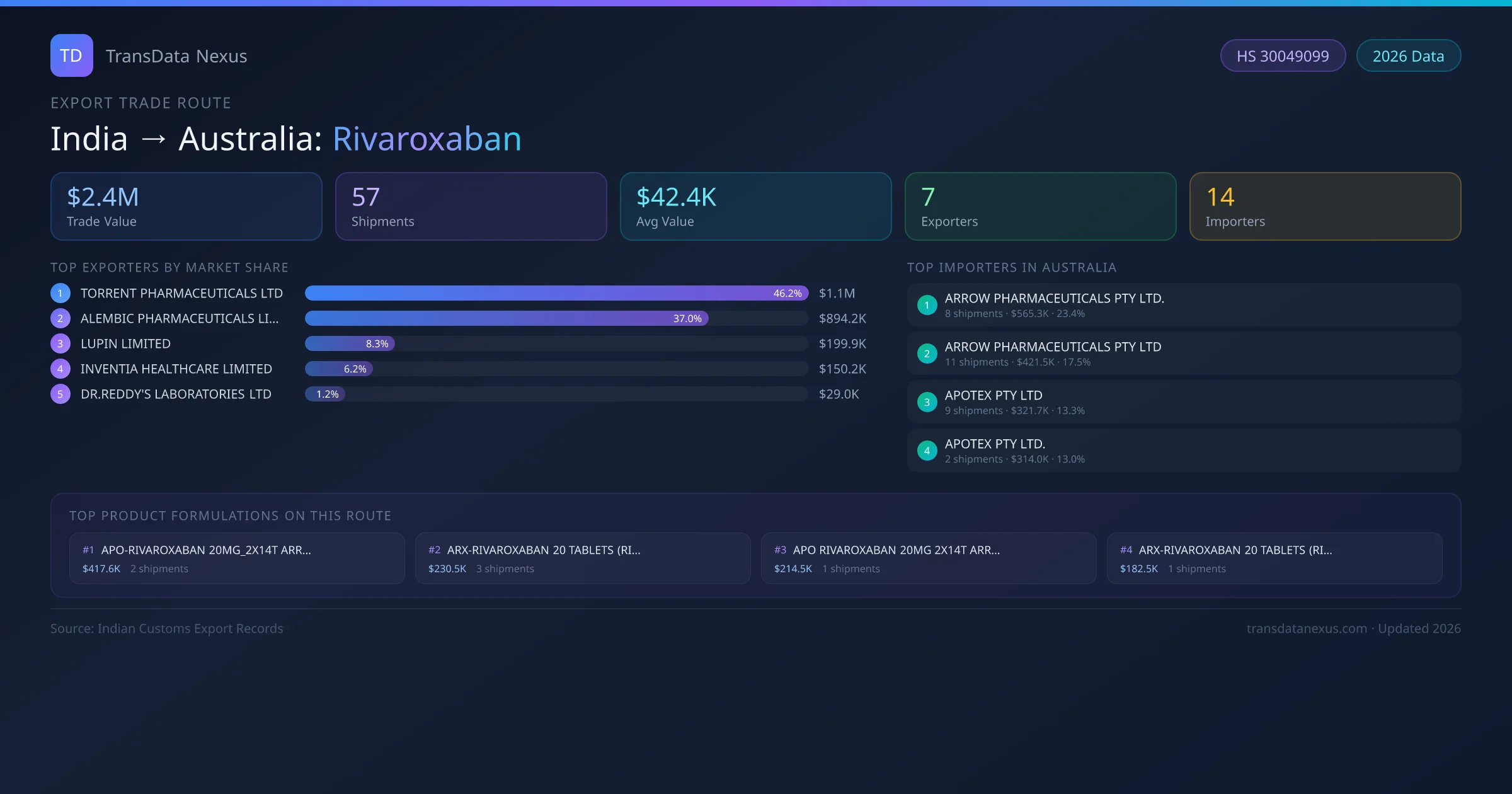 The leading Indian exporters of Rivaroxaban to Australia are TORRENT PHARMACEUTICALS LTD, ALEMBIC PHARMACEUTICALS LIMITED, LUPIN LIMITED. TORRENT PHARMACEUTICALS LTD holds the largest market share at approximately 46% of total trade value on this route.