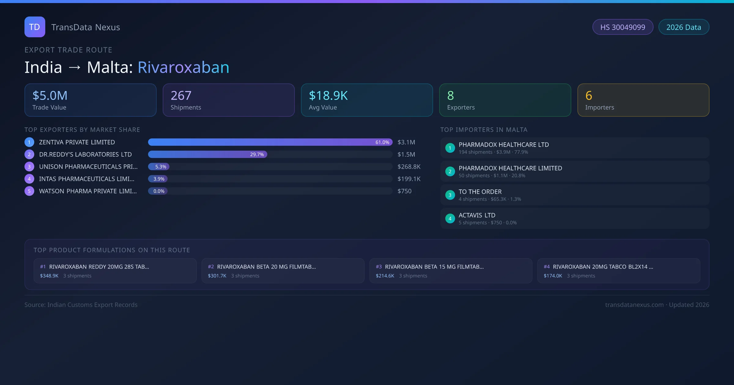 - 1.Route Identification: India to Malta export trade corridor identified from Indian Customs (DGFT) records for Rivaroxaban.