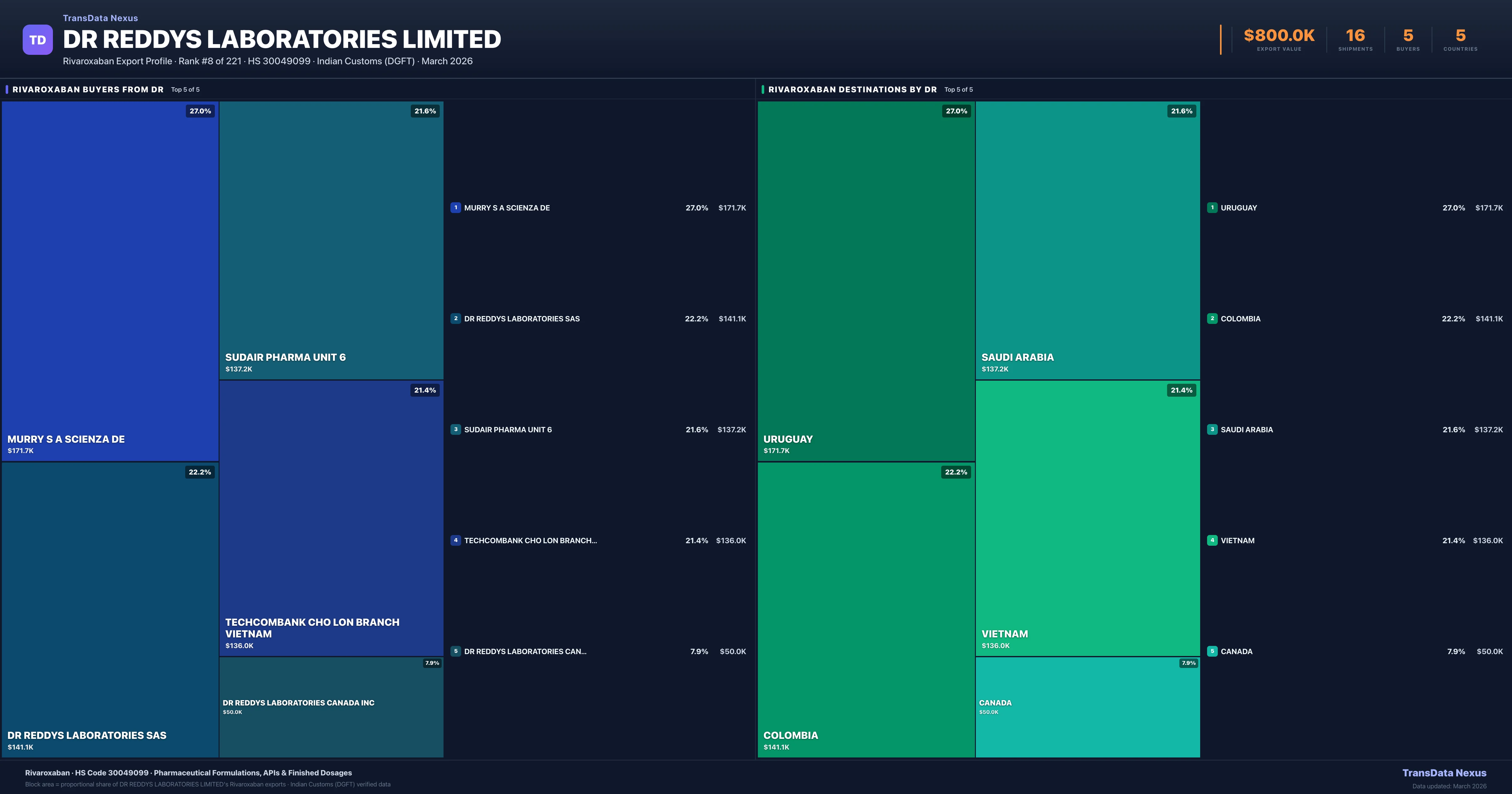 DR Reddys Laboratories Limited supplies Rivaroxaban to 5 buyers globally. The largest buyer is MURRY S A SCIENZA DE (URUGUAY), followed by DR REDDYS LABORATORIES SAS (COLOMBIA) and SUDAIR PHARMA UNIT 6 (SAUDI ARABIA). These buyers represent pharmaceutical distributors, hospital groups, and government procurement agencies in their respective markets.