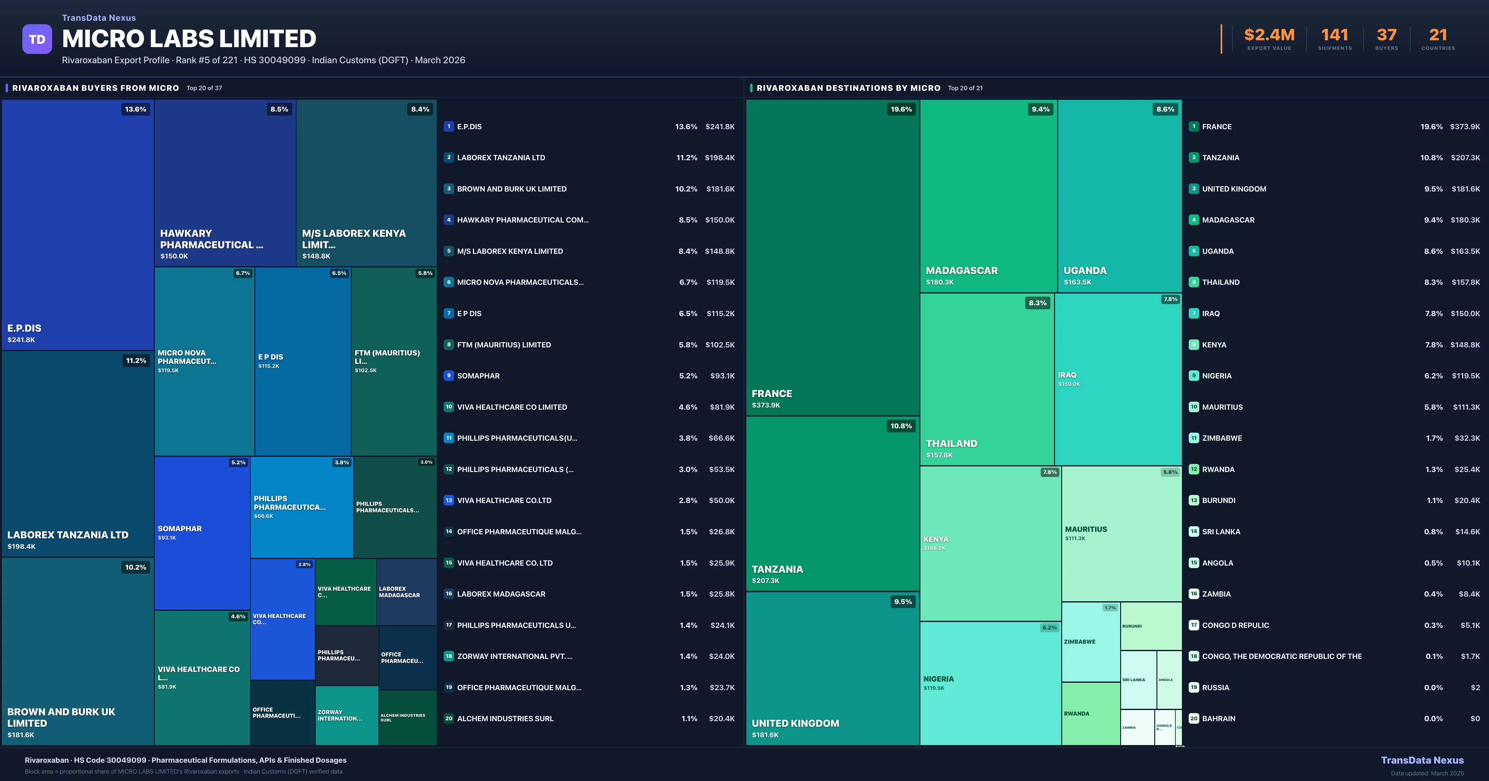 Micro Labs Limited supplies Rivaroxaban to 37 buyers globally. The largest buyer is E.P.DIS (FRANCE), followed by LABOREX TANZANIA LTD (TANZANIA) and BROWN AND BURK UK LIMITED (UNITED KINGDOM). These buyers represent pharmaceutical distributors, hospital groups, and government procurement agencies in their respective markets.