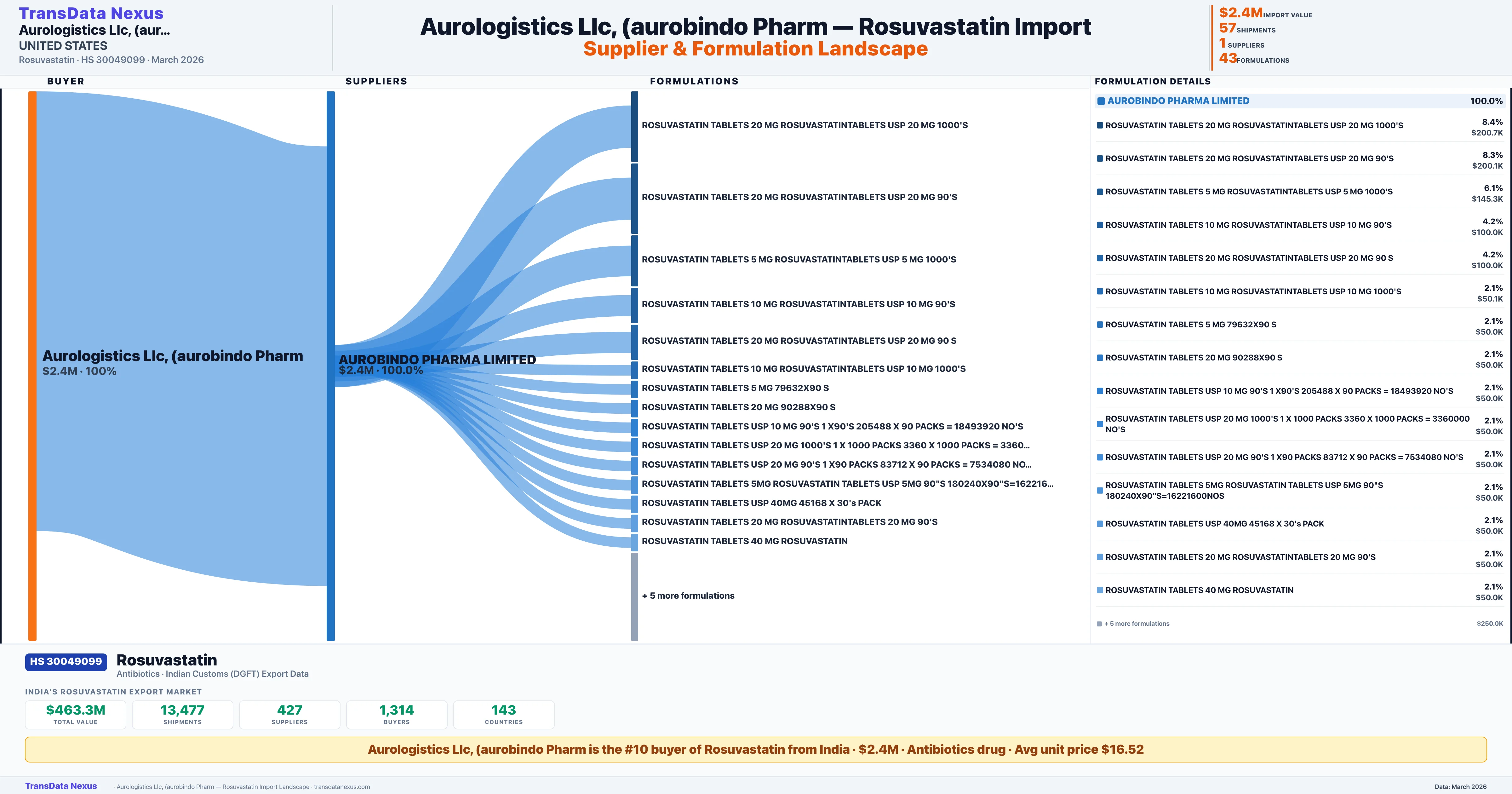 AUROLOGISTICS LLC AUROBINDO PHARM sources Rosuvastatin from 1 verified Indian supplier based on 57 customs records. The primary supplier is AUROBINDO PHARMA LIMITED accounting for 100.0% of imports.