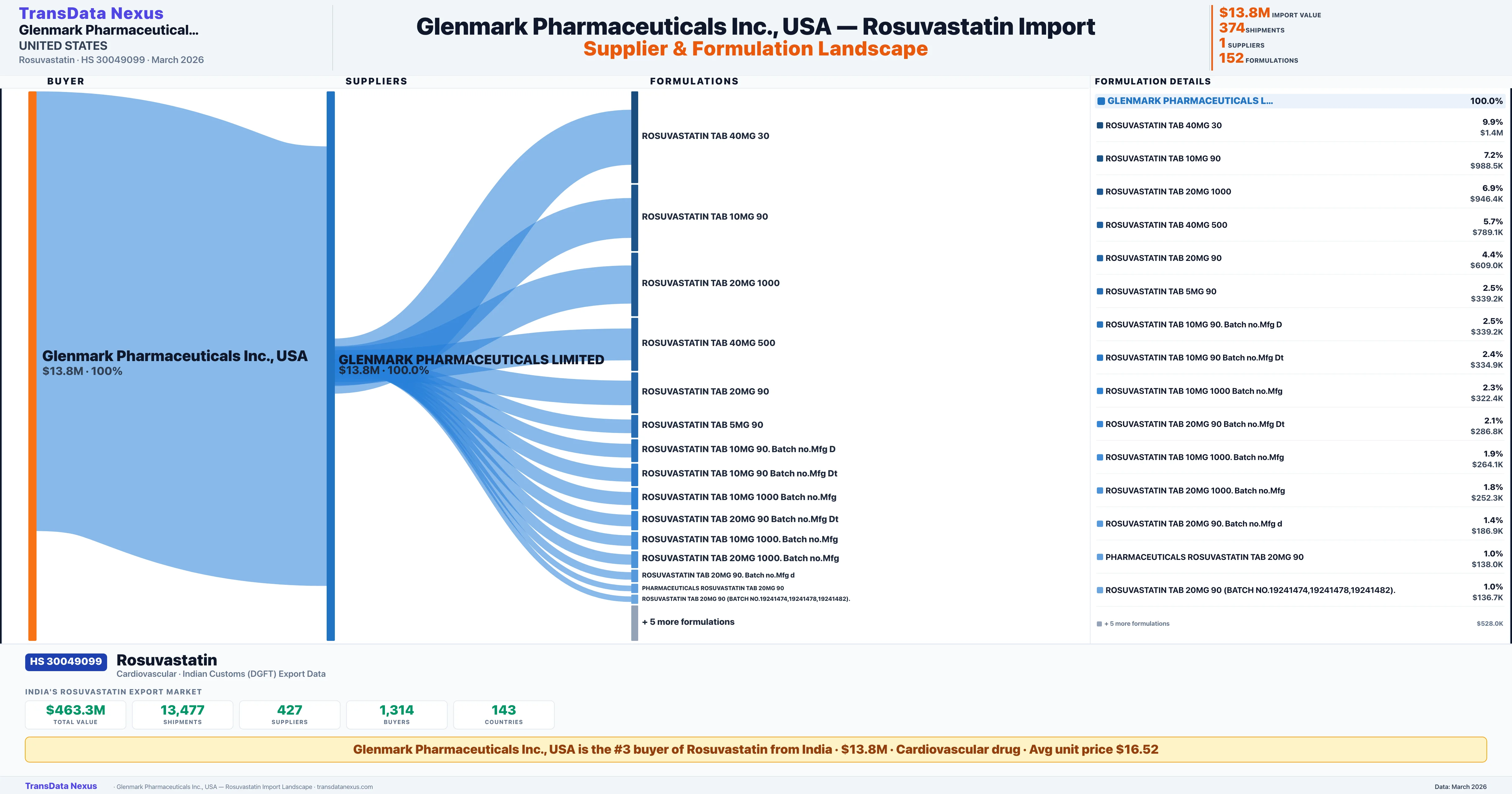 GLENMARK PHARMACEUTICALS INC., USA sources Rosuvastatin from 1 verified Indian supplier: GLENMARK PHARMACEUTICALS LIMITED ($13.8M, 100.0%). This is based on 374 customs records.