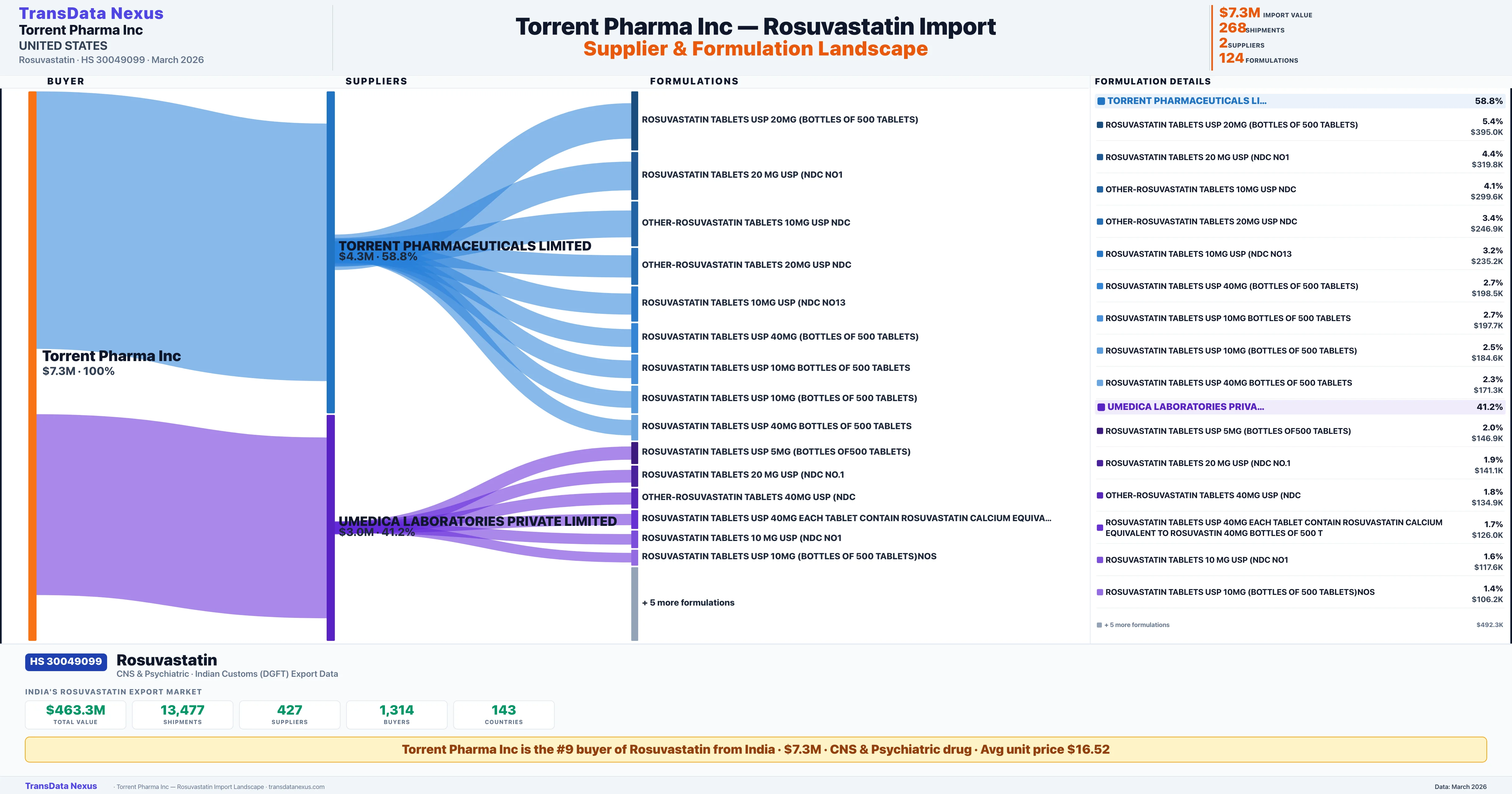 TORRENT PHARMA INC sources Rosuvastatin from 2 verified Indian suppliers: TORRENT PHARMACEUTICALS LIMITED ($4.3M, 58.8%), UMEDICA LABORATORIES PRIVATE LIMITED ($3.0M, 41.2%). This is based on 268 customs records.